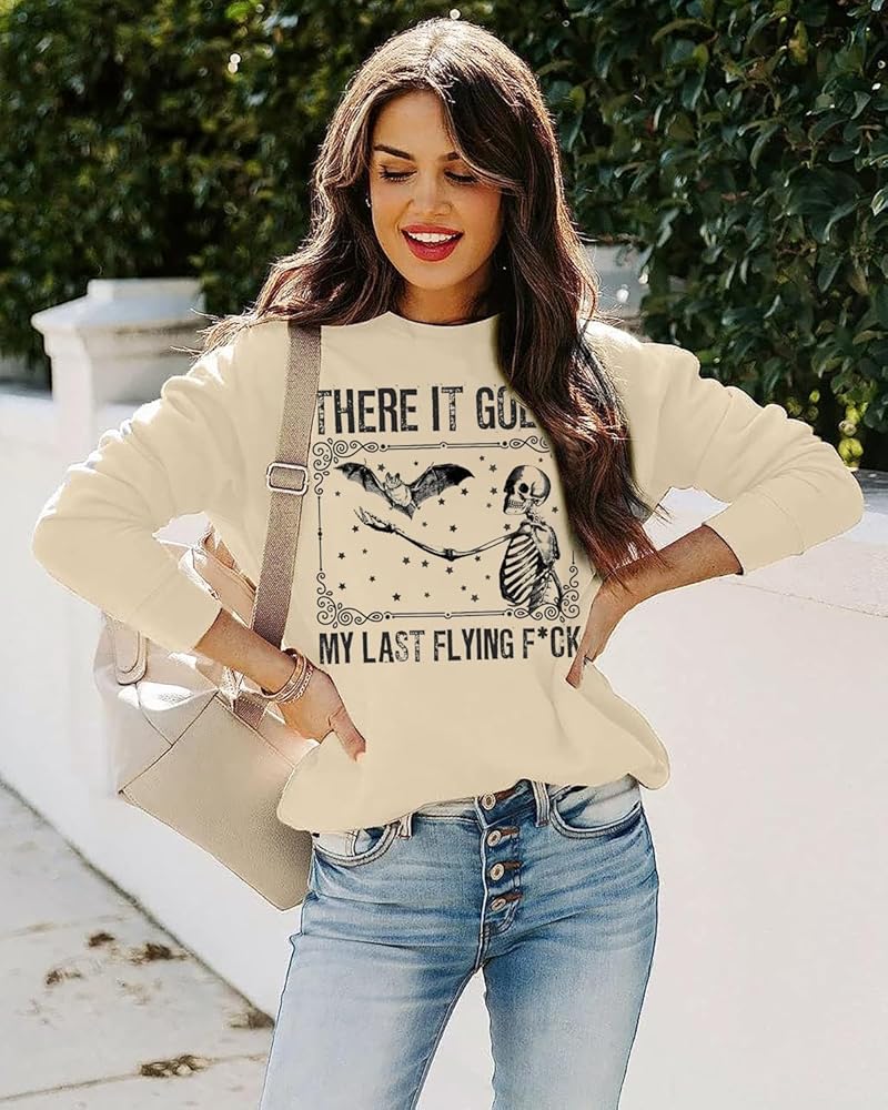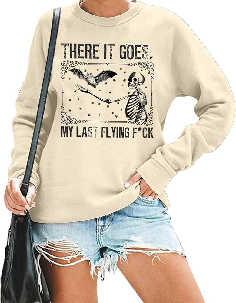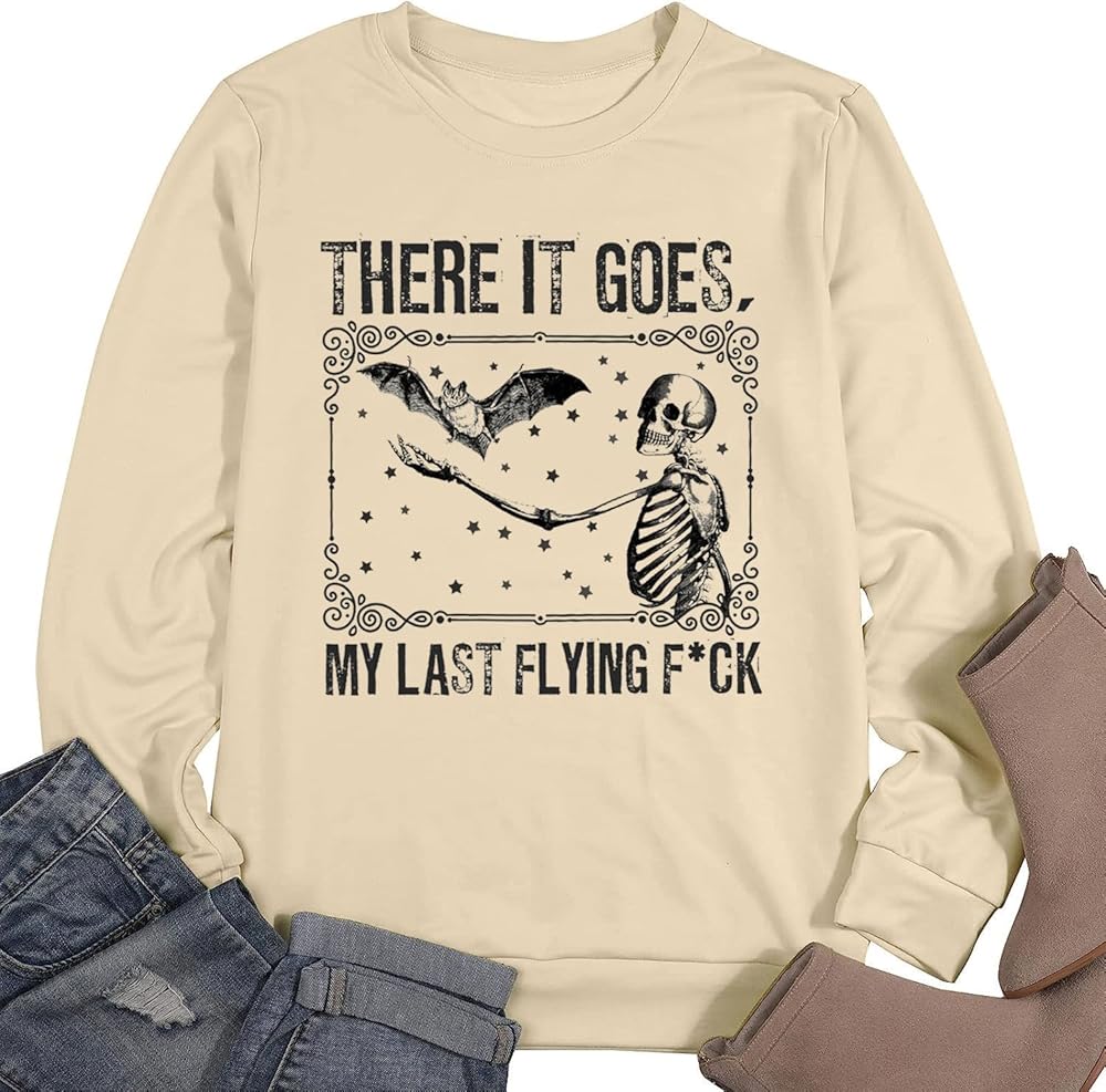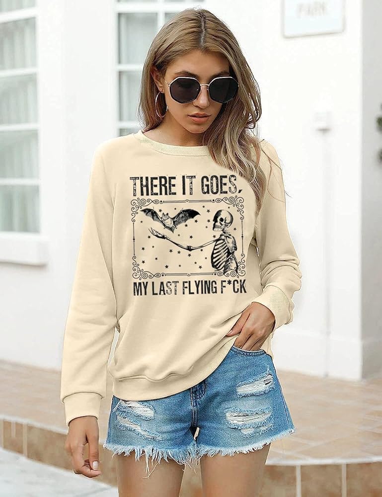 There It Goes My Last Flying F*ck Sweatshirt Women Halloween Skeleton Bat Graphic Pullover Top Funny Saying Fall Long Sleeve Shirt