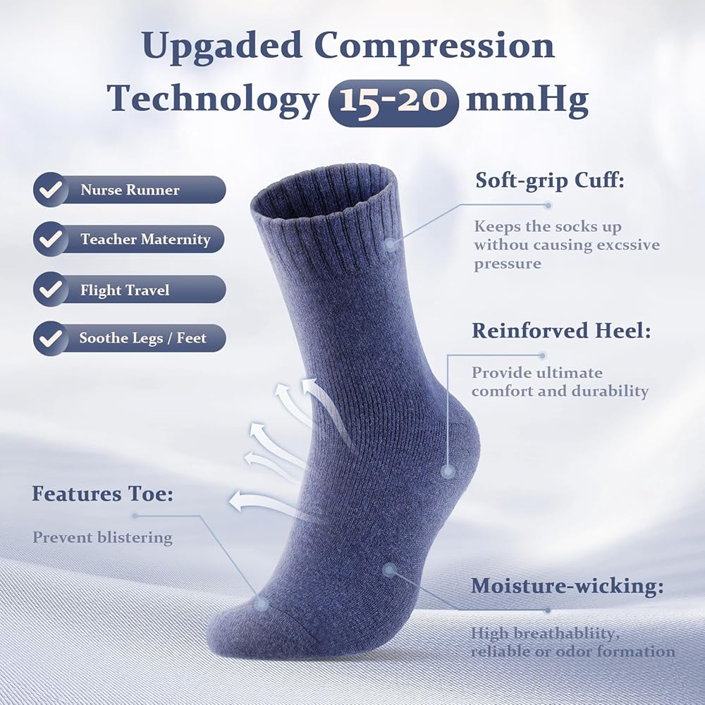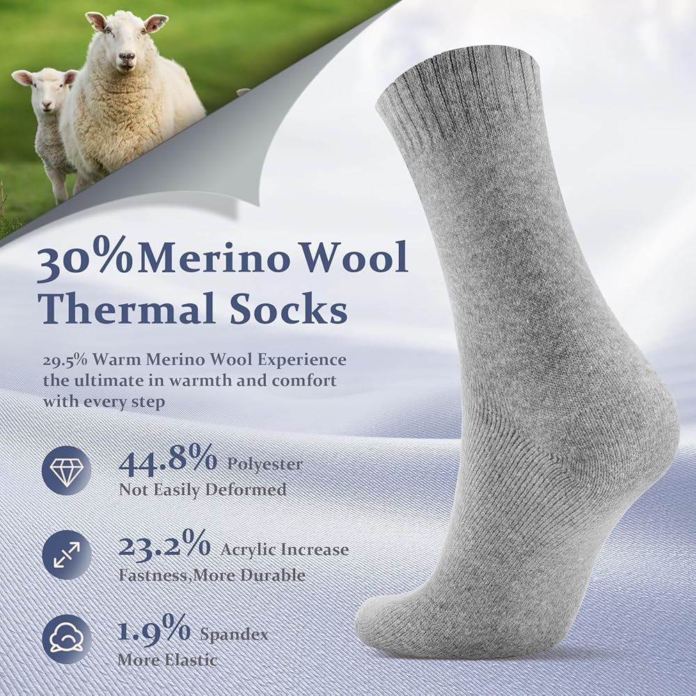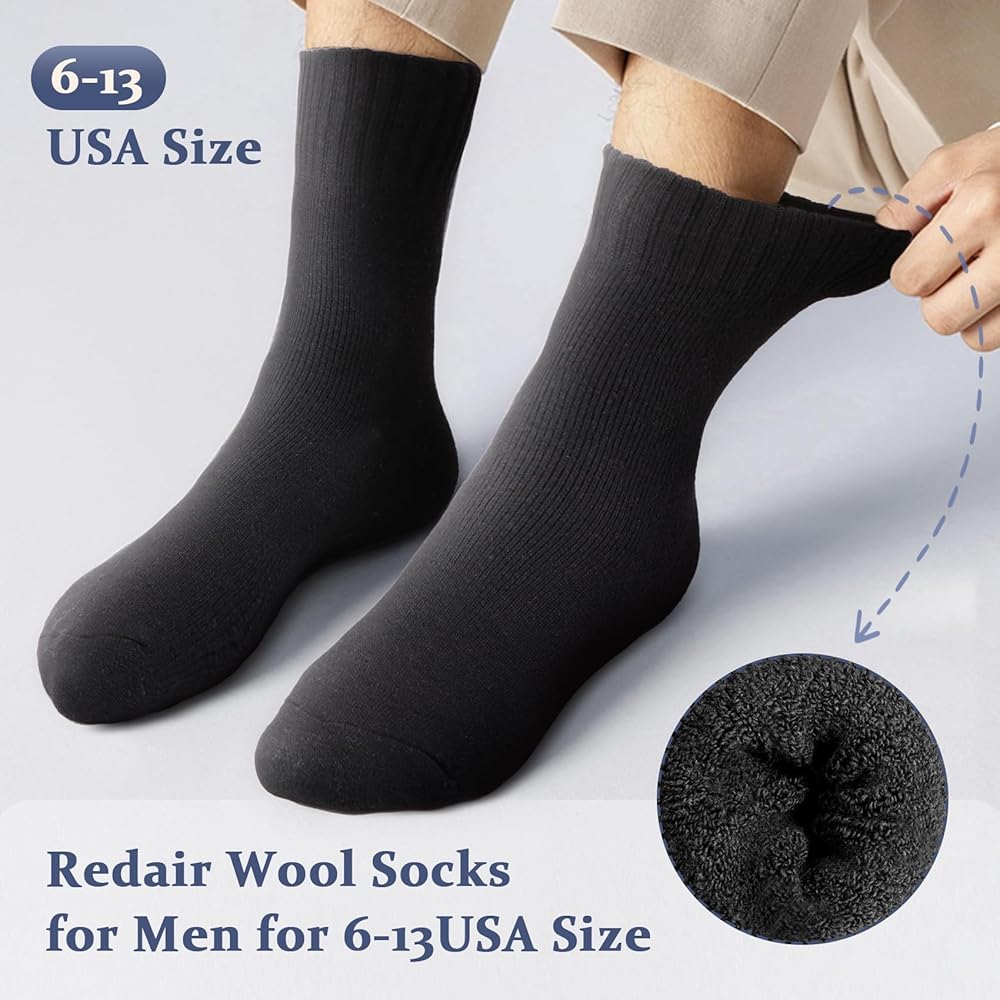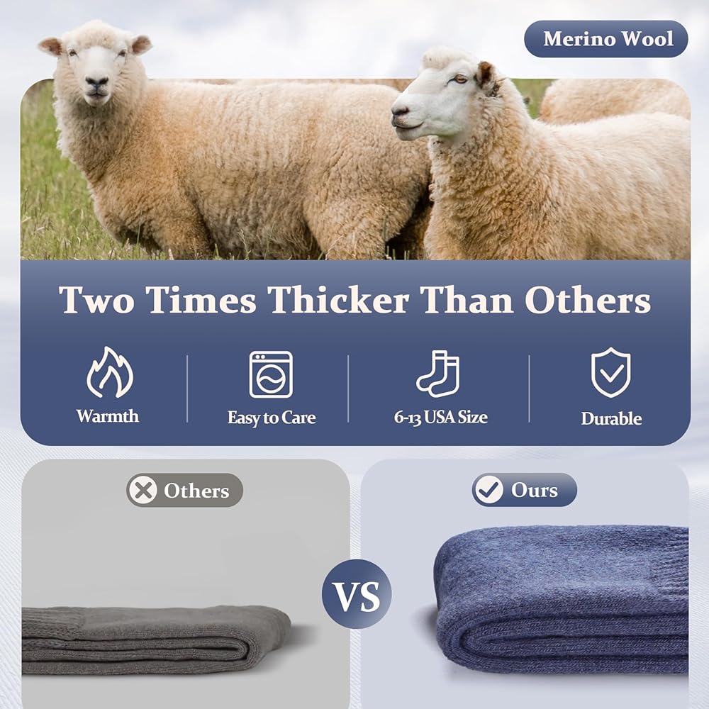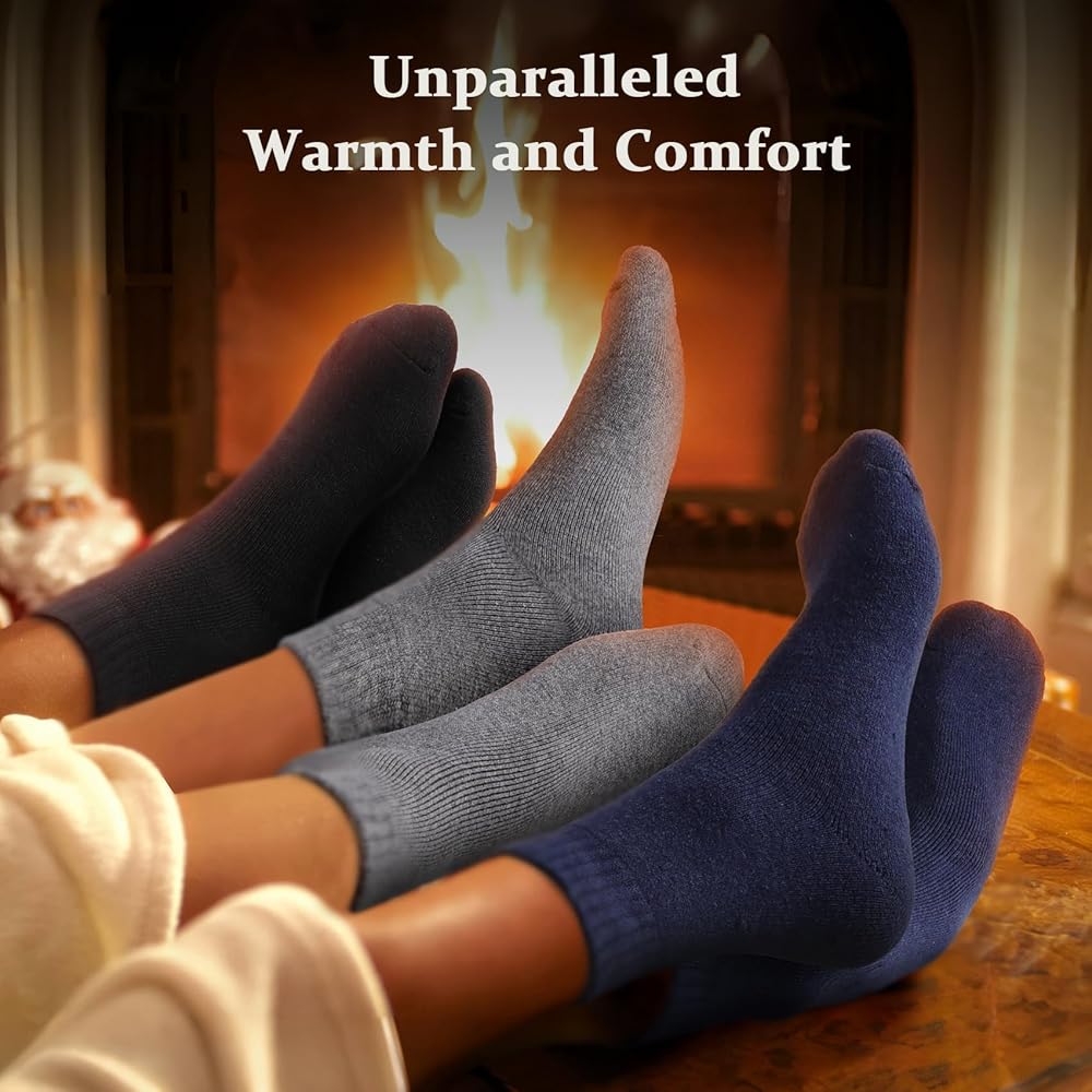 دفء فائق: يعزز النسيج السميك العزل الحراري، مما يجعل كل زوج من الجوارب يشعر وكأنه احتضان مريح خلال أشهر الشتاء الباردة. تعمل هذه الجوارب الصوفية كمدفأة دافئة لقدميك، مما يبقيها دافئة ومحمية من الطقس القاسي. ثق بنا - سوف تشكرك قدميك على الدفء والراحة التي توفرها.