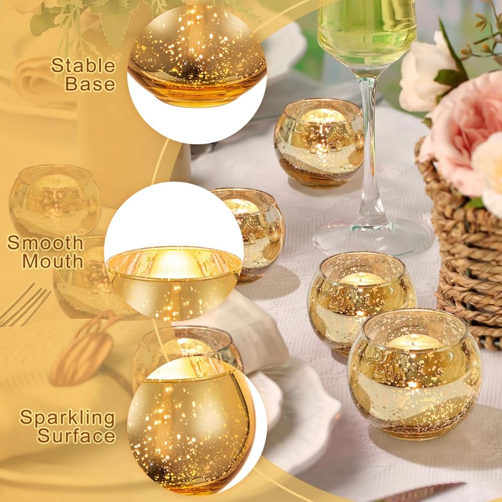 Premium and Stylish: Our Gold Votive Candle Holders are made from thick and strong glass, ensuring their durability and resistance to breakage. The charming and textured gold finish adds a touch of elegance to any setting, making them perfect for weddings, birthdays, and other special occasions.