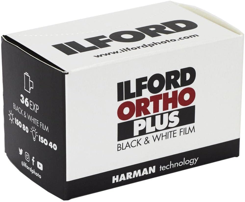 35mm, ISO 80 orthochromatic black & white film with fine grain and sharpness - perfect for stunning landscapes. Ilford Ortho Plus is an Orthochromatic black and white film. Designed as a high-resolution copy film for negatives, Ortho Plus offers superb photographic potential thanks to its fine grain and sharpness. Ideally suited for landscape photography, the blue and green sensitivity of this emulsion enables the film to be handled in deep red safelight conditions making processing and inspection easier.Its lack of red sensitivity also means that reds and oranges in your frame are rendered darker with stronger contrast than standard panchromatic films (all other Ilford and Kentmere films are panchromatic). Ilford Ortho PLUS is DX coded for ISO 80 for daylight / natural light shooting. For tungsten work a manual ISO setting of 40 should be used. Alternatively, a 1 stop exposure correction can be made. Whether shooting at ISO 80 or 40, it can be processed as standard. Development times can be found in the technical data sheet or on the inside of the film cartons.