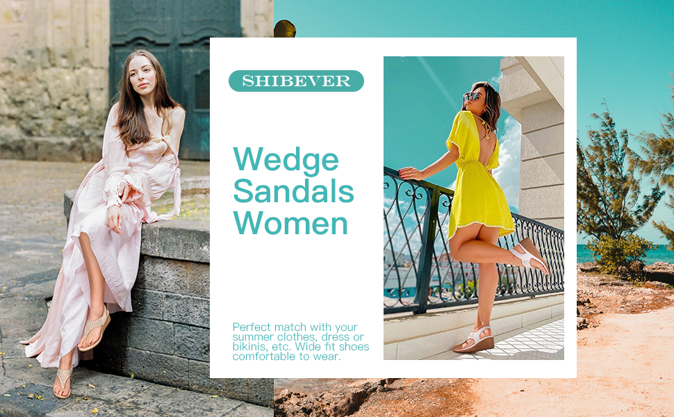 SHIBEVER Wedge Sandals for Women Elastic Ankle Strap Sandals T-Strap