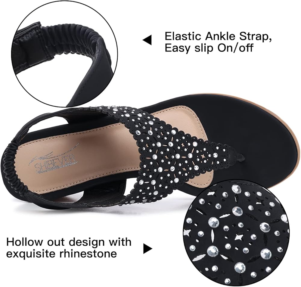 • 【Design】Stylish Womens rhinestone sandals, elastic ankle strap sandals, easy to slip on/off. Hollow out wedge sandals, low wedge sandals women, midi-heel shoes women, womens wedge sandals with arch support, fashion and cute wedge heel shoes, slingback slip-on T-Strap thong sandals women.