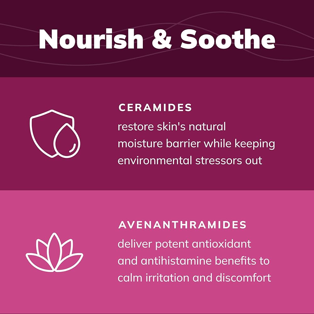 • Contains skin nourishing ceramides and avenanthramides that moisturize and calm skin and support the skin's natural immune system and provide building blocks for renewed skin barrier integrity