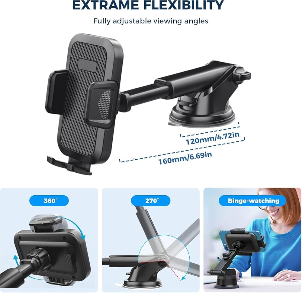 • Free Angle Adjustment:Car phone holder with 360 degree ball joint and adjustable telescopic arm, which can adjust your phone to any ideal angle without neck or eye strains.You can use this mobile phone holder for car vertically or horizontally either, extremely flexible. Doesn't block your view while driving.