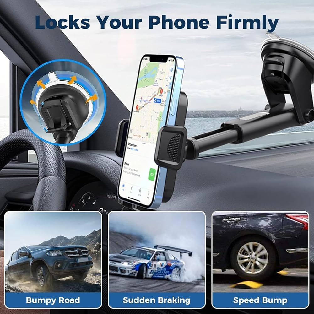 • Enhanced Suction Cup, More Stable:iPhone car mount features a strong suction cup and non-slip silicone arms to keep your phone securely in place even when driving on bumpy roads.Suitable for most cars, pickup trucks,SUVs,trucks and taxis;the best assistant for Uber and Lyft drivers.