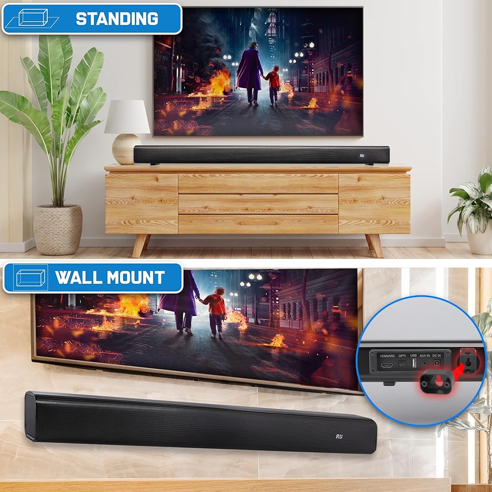 Introducing the 32'' 2.0 Channel Convertible Soundbar – a sleek and powerful audio solution for your home entertainment needs. Equipped with a built-in Class D Stereo Power Amplifier and four 2” full-range drivers with Y35 ferrite magnets, this soundbar delivers exceptional sound quality with forward-firing speakers for maximum SPL and sound staging. The built-in Bluetooth technology allows for effortless wireless music streaming, compatible with all of today's latest devices, including smartphones, tablets, laptops, and computers. The Bluetooth version 5.0 ensures a stable connection with a range of up to 32.8 feet. The soundbar features multiple input options, including a 3.5mm auxiliary input, optical input, USB/TF card input, and HDMI ARC input, providing versatile connectivity for all your audio sources. Additionally, the built-in LED lights add a stylish touch to your setup. Included in the box are the main speakers, a power adaptor, and a remote control, giving you everything you need to start enjoying high-quality sound right out of the box. With a maximum power of 80W and RMS power of 30W, this sound bar ensures powerful audio performance. Its compact dimensions of 31.5'' x 2.4'' x 2.4'' make it a perfect fit for any room. Upgrade your home audio experience with the 32'' 2.0 Channel Convertible Soundbar – where superior sound meets modern convenience.