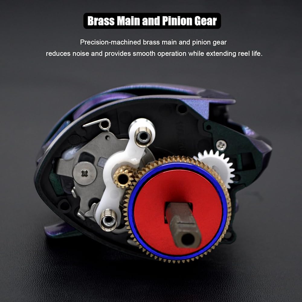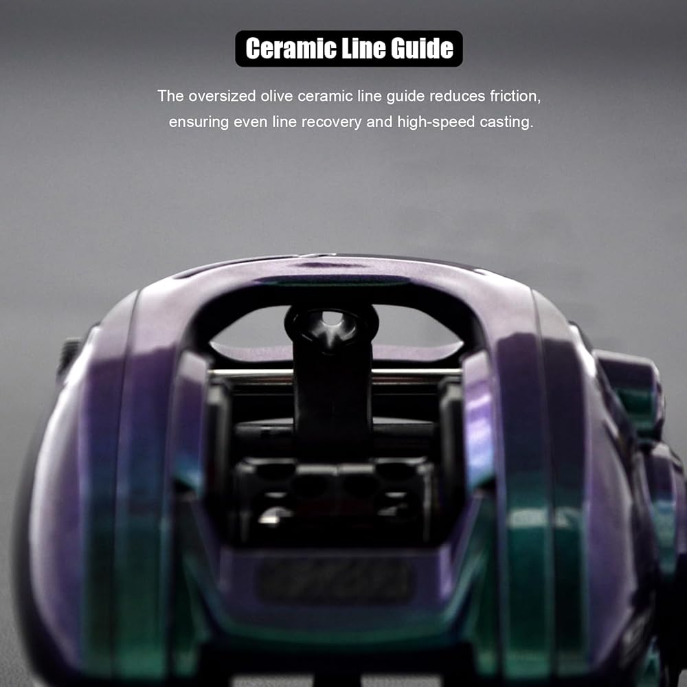 Powerful and Reliable - Precision machined brass main and pinion gear and extra-hard stainless steel main shaft for higher speeds and lower noise. Easy to adjust star drag system allows you to adjust the amount of drag as you fight the fish, delivering up to 18.7lb of smooth, powerful drag that lets you land every big fish with ease. The oversized olive ceramic line guide reduces friction, ensuring even line recovery and high-speed casting.
