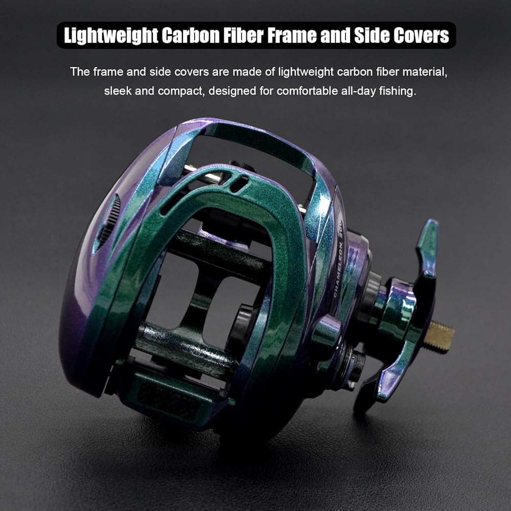 Low Profile Design - As the name Chameleon Paint suggests, the Chameleon 200 baitcasting reels use a gradient color paint and light gold accent scheme that imparts different colors at different angles, allowing for noticeable and dynamic color changes. The frame and side covers are made of lightweight, durable carbon fiber, weighing only 184 grams (6.5 ounces) and featuring a sleek, compact body designed for comfortable all-day fishing.