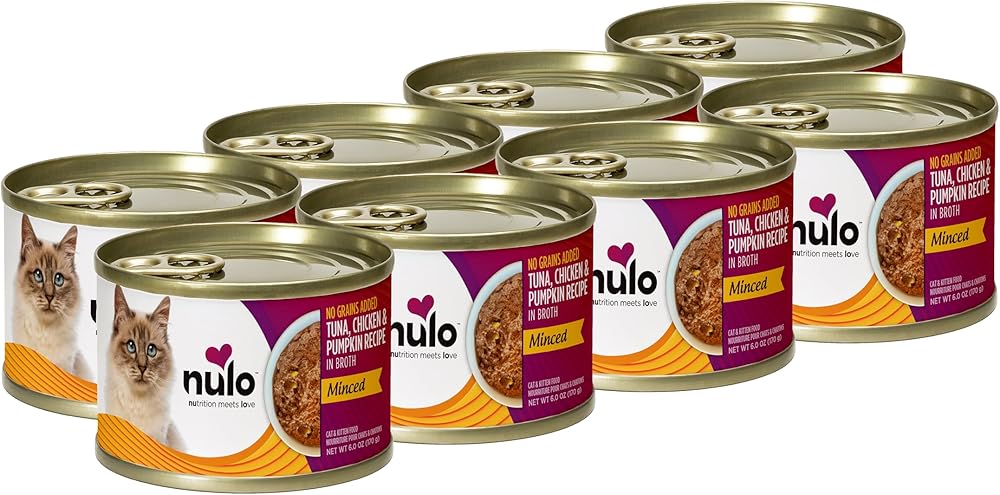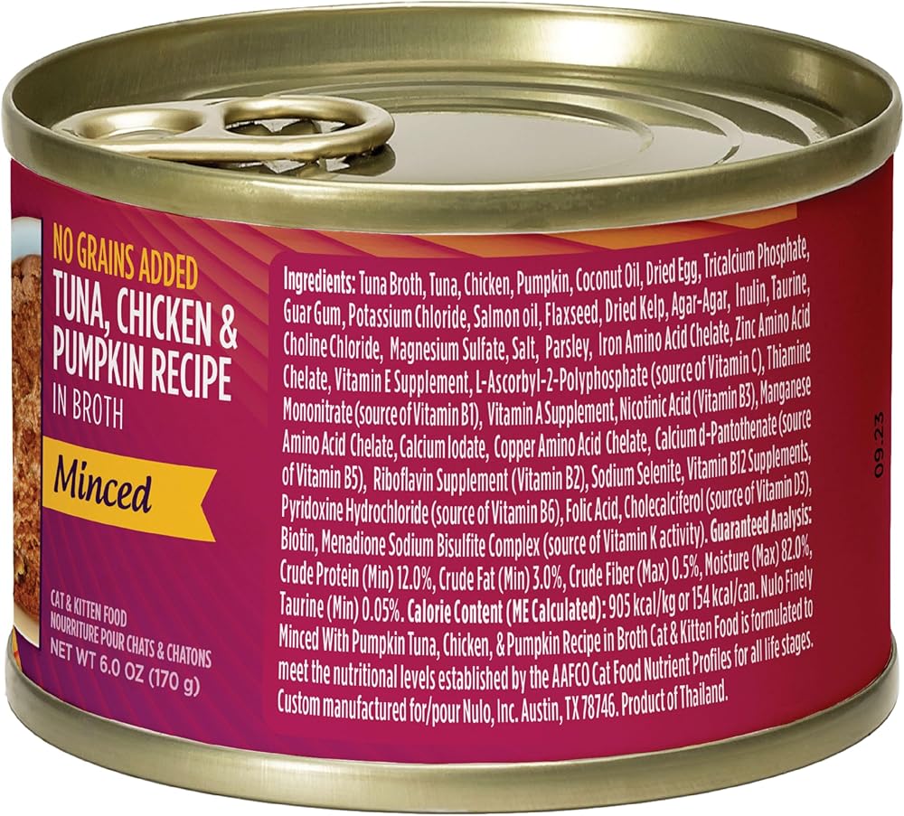 Nulo Minced Tuna, Chicken & Pumpkin recipe is filled with rich protein and a savory taste your cat won't be able to resist. This complete and balanced meal with a tempting minced texture will ensure they are always ready for mealtime and have the fuel they need for their everyday adventures. Contains NO grains, carrageenan, corn, wheat, soy or artificial preservatives, colors or flavoring.