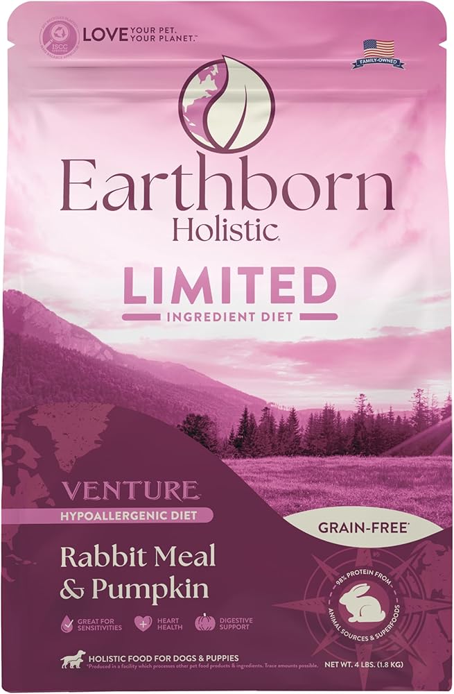 Earthborn Holistic Venture Rabbit Meal and Pumpkin is a limited ingredient diet for dogs. It focuses on giving you EVERYTHING YOU WANT and NOTHING YOU DON'T. No grain, No gluten, No potato, No egg, No colorants, No fillers, No by-products, No artificial preservatives. 95% of the protein comes from only 3 ingredients; 40% from rabbit, 37% from peas and 18% from pumpkin. You can't expect to create exceptional dog food unless you make the effort to find the best ingredients, and sometimes the journey to finding the best ingredients is an exciting venture. Our rabbit meal comes from rabbits born and raised exclusively in the Pays de la Loire, Nouvelle-Aquitaine and Brittany regions of France. It is with pride and passion that rabbit farmers ensure they meet the rabbits' needs on a daily basis. They are committed to feeding 100% vegetable diets, giving attentive care and providing proper shelter environments, following strict European regulations. These farmers believe quality animal feed and responsible care results in the production of safer, high-end rabbit products. In addition to rabbit meal, our limited ingredient grain-free diet includes carefully selected, vine-ripened pumpkins from California's lush Central Valley. Pumpkin is an excellent source of high-quality fiber to help regulate the digestive system and to help maintain a healthy immune system. Venture is focused on creating a defined diet for dogs made of superior ingredients with the health and safety of your pet in mind, we only choose sources we can trust. We may have limited the ingredients, but the nutrition and palatability are nothing close to limited. Earthborn Holistic Venture products are proudly produced in our family-owned company kitchens here in the US. Renewable resources are used in the making of all Earthborn Holistic Venture packaging. Earthborn's PlantBag contains up to 30% plant-based plastic, made from renewable and sustainable Brazilian sugarcane ethanol.