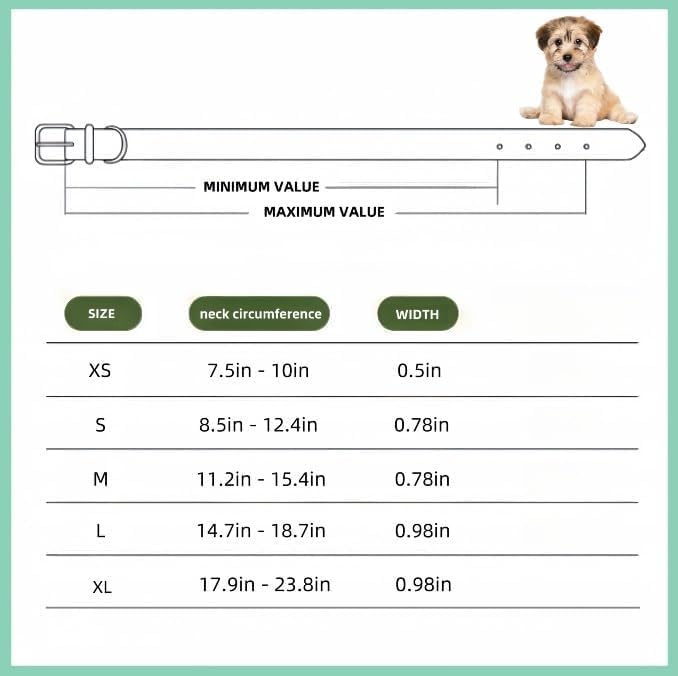 مرجع الحجم: طوق مقاس XS قابل للتعديل من 7.5 بوصة إلى 10 بوصات. طوق مقاس S قابل للتعديل من 8.5 بوصة إلى 12.4 بوصة. طوق مقاس M قابل للتعديل من 11.2 بوصة إلى 15.4 بوصة. طوق المقاس L قابل للتعديل من 14.7 بوصة إلى 18.7 بوصة. مقاس XL قابل للتعديل من 17.9 بوصة إلى 23.8 بوصة. طول مقود الكلب في المقاسات S إلى L هو 4.9 قدم طول مقود الكلب في المقاس XL هو 6 قدم