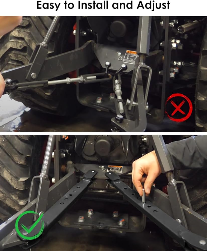 Enhanced Stability and Safety: The stabilizer kit provides additional lateral support to prevent the mounted equipment from swaying or moving from side to side during operation, improving the stability and safety of tractors and mounted equipment in uneven terrain and heavy duty operations