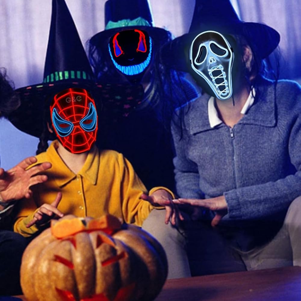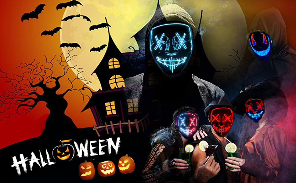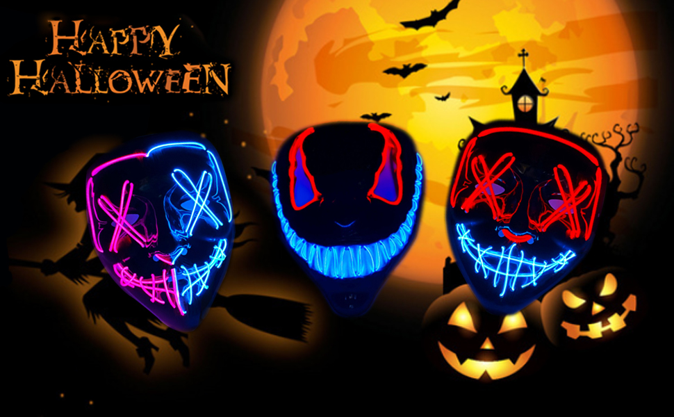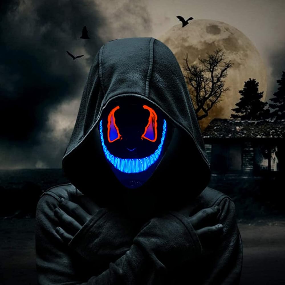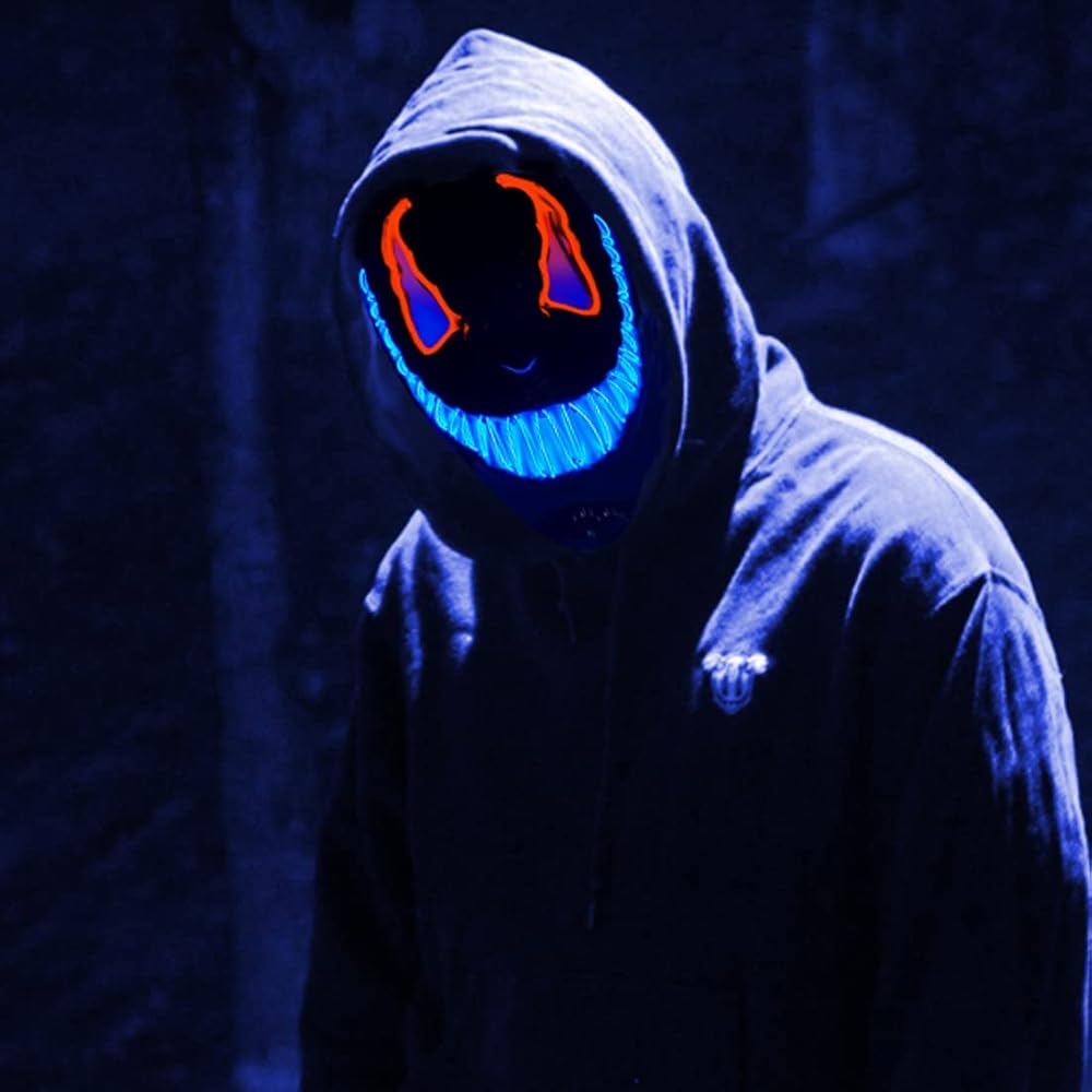 هذا القناع هو بداية محادثة وسيضمن لك التميز بين الآخرين. بغض النظر عن مكان وجودك، سوف تحصل على الكثير من الاهتمام من الآخرين الذين لديهم فضول بشأن قناعك. ممتعة لجميع الأعمار. القناع المتوهج المخيف مصنوع من البلاستيك (PVC الممتاز) ويتضمن شريطًا مطاطيًا لوضعه حول رأسك لتثبيته في مكانه، كما تحتوي أقنعة LED أيضًا على فتحات في منطقة العين والأنف والفم. لا توجد رائحة بلاستيكية رديئة، ولا توجد رائحة نفاذة، ويمكن ارتداؤها براحة البال.