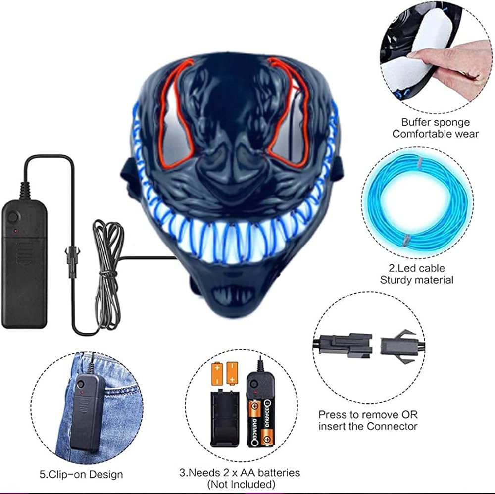 قناع مخيف متوهج LED للهالوين يحتاج إلى بطاريتين AA (غير متضمنة) للعمل. عمر طويل: 10000 ساعة، عمل بدون درجة حرارة أساسية، درجة حرارة العمل أقل من مصباح الفلورسنت. قم بتركيب حزمة الطاقة في جيبك أو على ملابسك.