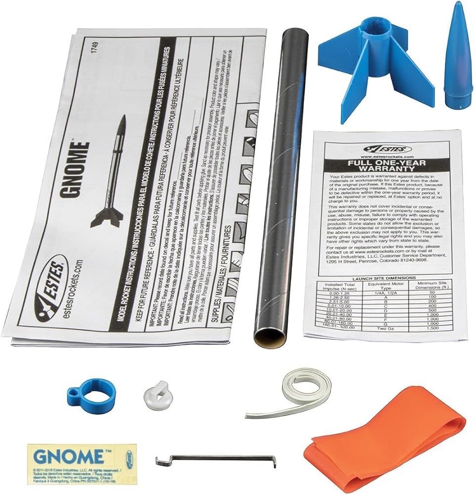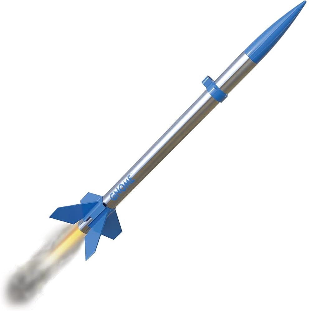 The Gnome is chrome at its hottest. This smooth, ballistic bullet is a classy looking little sprite with blistering speed to match. Standing just a little over 10 " (26 cm) with super shiny chrome and sapphire blue colors, this is one great looking, mini engine powered cloud chaser that can reach altitudes of well over 800 ' (244 m). Recovery is safe and reliable with its fluorescent colored streamer for easy tracking after a super fast flight. The Gnome is another in our series of E2X (easy to assemble) kits and features a single piece, chrome wrapped body tube, a bright blue precolored one piece fin unit, nose cone and upper launch lug ring. The rocket takes about 30 minutes to build and is finished off with a colorful, easy to apply self-stick decal. With its simple assembly and precolored parts, it an excellent choice for the first time rocketeer. Estes mini engines and Estes launch supplies required — sold separately. Recommended for ages 10 and up with adult supervision for those under 12.