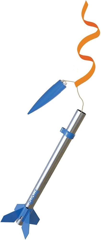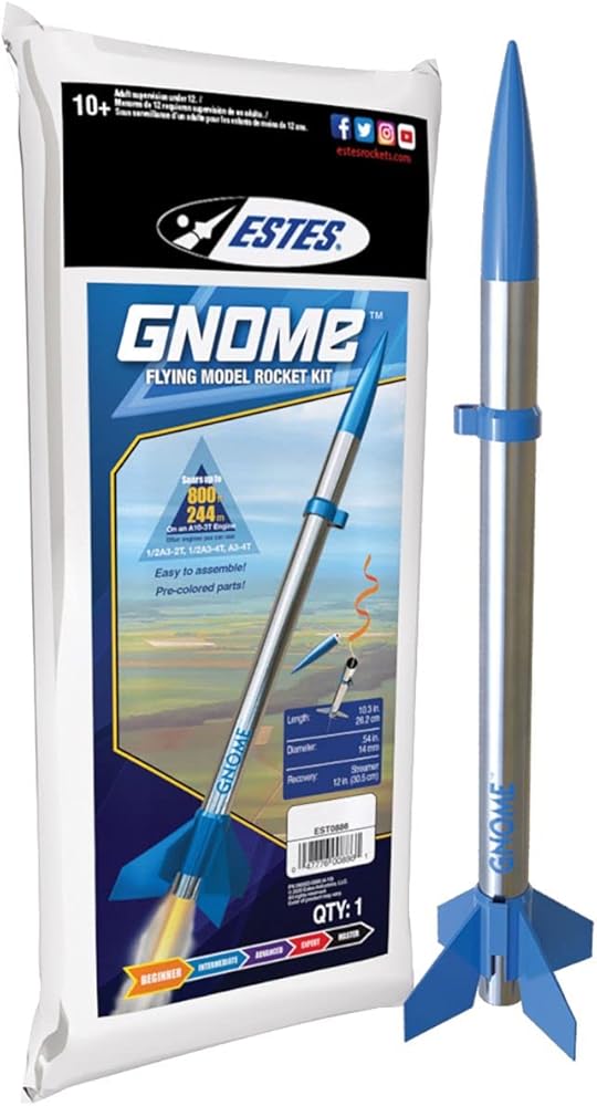 The Estes Gnome Flying Model Rocket Kit 0886 is chrome at its hottest! Standing just a little over 10 inches. tall with super shiny chrome and sapphire blue colors, this is one great looking, mini engine powered cloud chaser that can reach altitudes of 800 feet. Recovery is reliable with its orange colored streamer for easy tracking after a superfast flight!