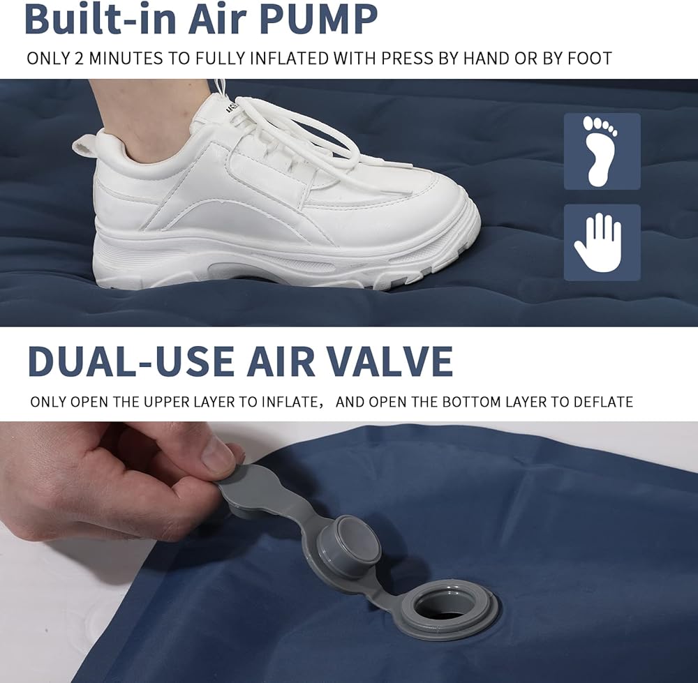 Built in Foot Pump: The camping mat is built in a foot pump,just simply stomp on the built-in air pump at the bottom of the sleeping pad for only 1-3 minutes to achieve super fast inflate.No more inflating by mouth or air pump.Double valve design, with the release valve to quickly deflate.