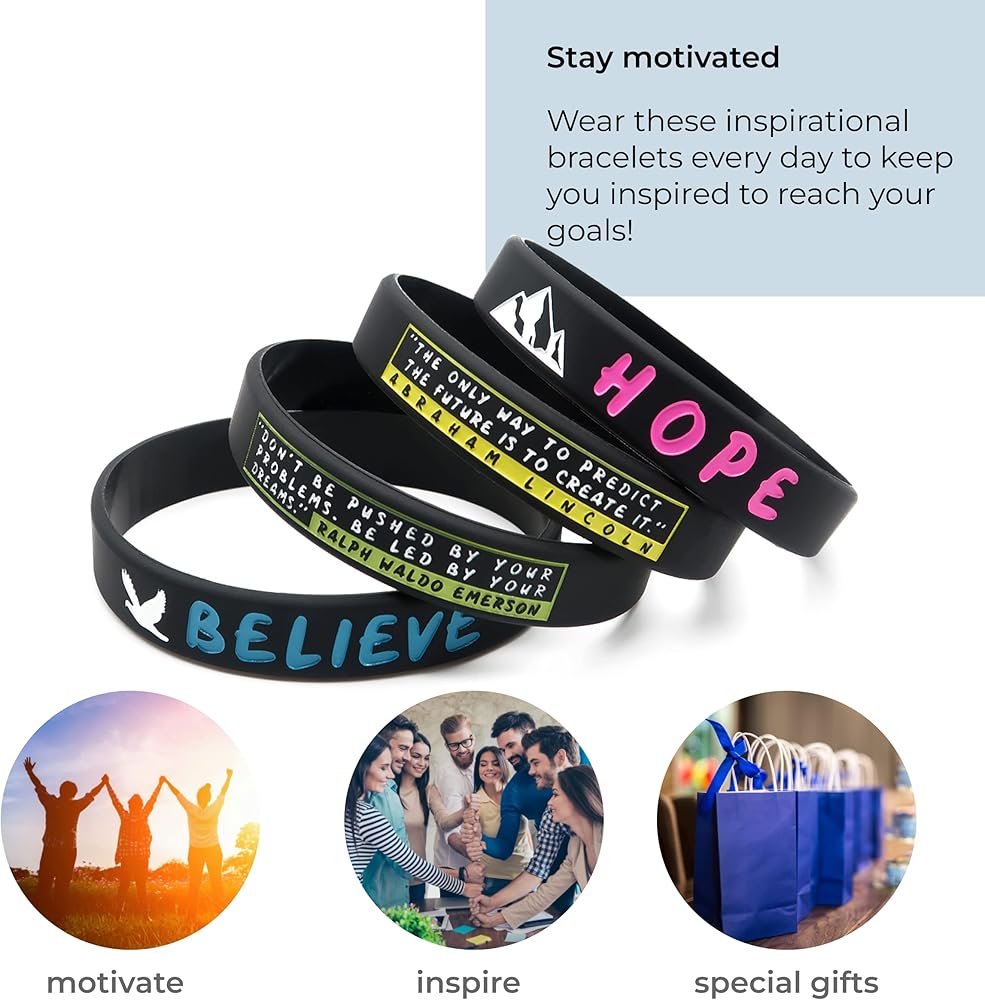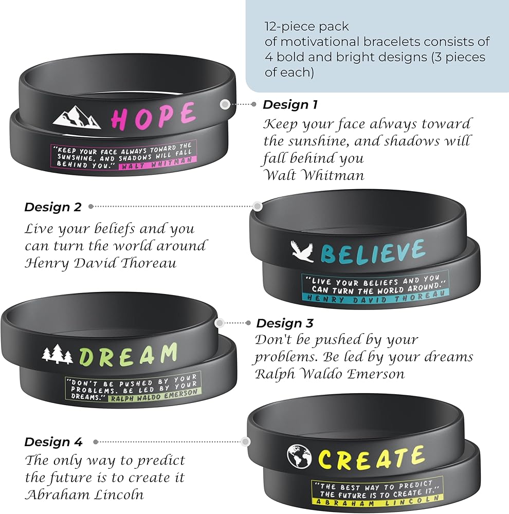 • This 12-piece pack of motivational bracelets consists of 4 bold and bright designs (3 pieces of each) with the quotes: ""Keep your face always toward the sunshine, and shadows will fall behind you"" by Walt Whitman; ""The only way to predict the future is to create it"" by Abraham Lincoln; ""Live your beliefs and you can turn the world around"" by Henry David Thoreau and ""Don't be pushed by your problems. Be led by your dreams"" by Ralph Waldo Emerson.