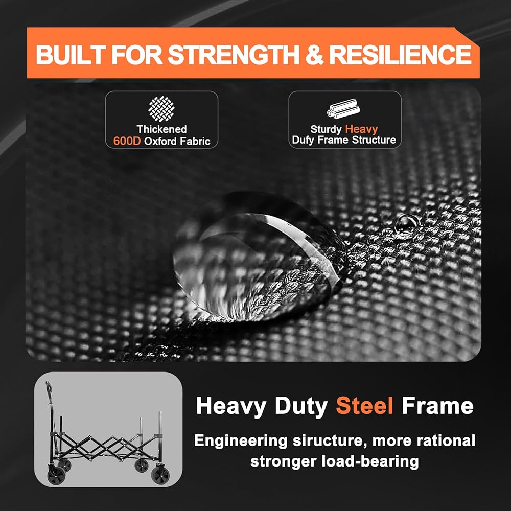 🌟EXTRA LARGE CAPACITY - DURABLE COLLAPSIBLE WAGON: The collapsible wagon has an expansion size of 32"x 18"x 37.2" (L*W*H) and load up to 220LBS, which can carry all the goods your family needs for outdoor camping. The wagon body is made of lightweight aluminum alloy, compared to other products, our product is lightweight and strong, with anti-corrosion coating on the surface, which can prevent the body from rusting. Waterproof fabric, waterproof and durable, tear resistant, removable and washable.