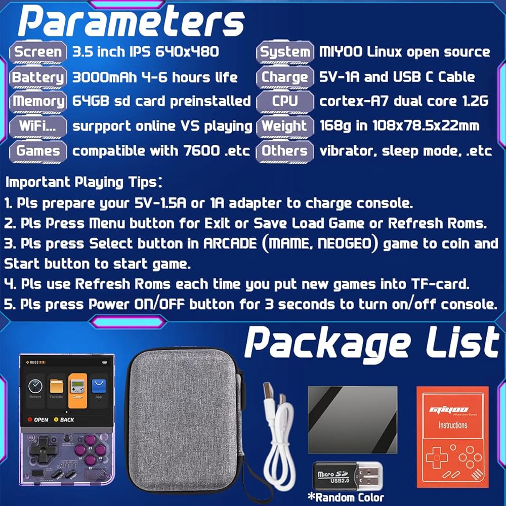 Package Including: 1*Miyoo Mini Plus Retro Gray, 1*Portable Case, 1*Screen Protector, 1*USB-C Charging Cable, 1*TF-card Reader, 1*Manual.