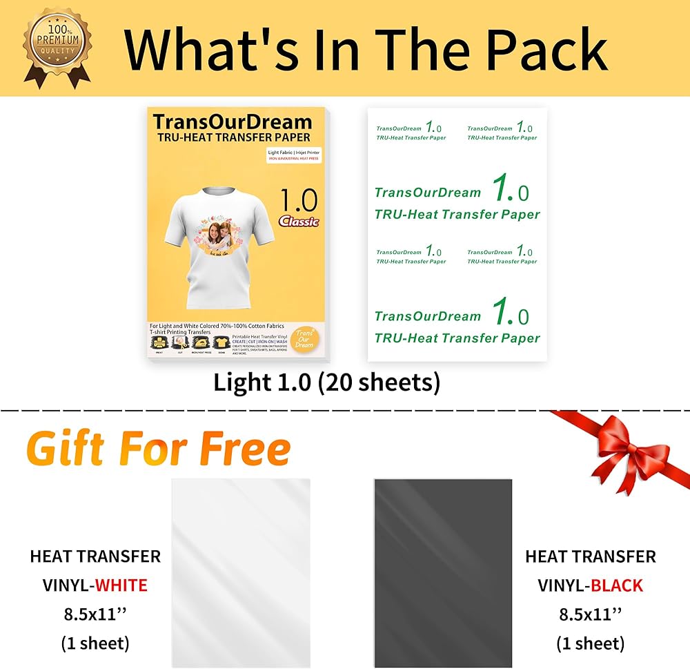 TransOurDream Tru-Heat Iron on Transfer Paper for Light Fabric (20 Sheets, 8.5x11") Printable Iron on Transfers Paper for Inkjet Printer & Heat Transfer Vinyl for T Shirts (2 Sheets, 8.5x11")