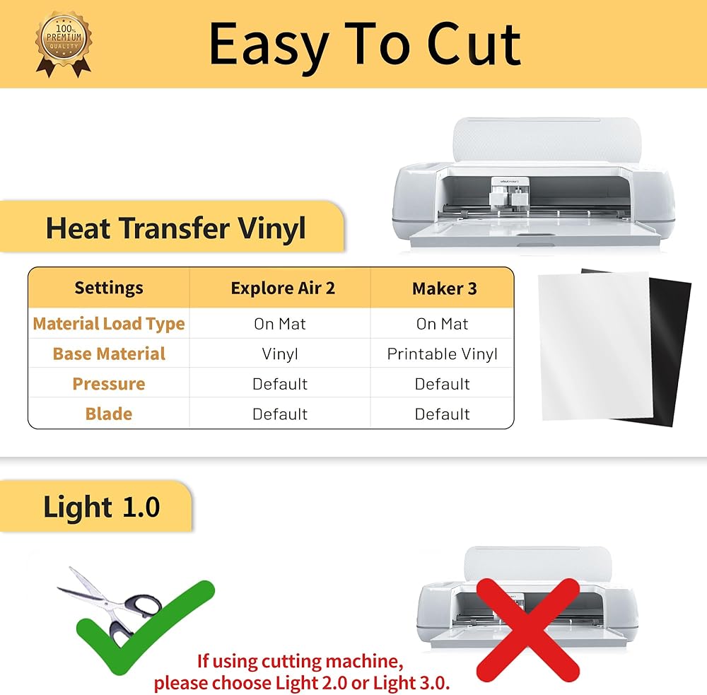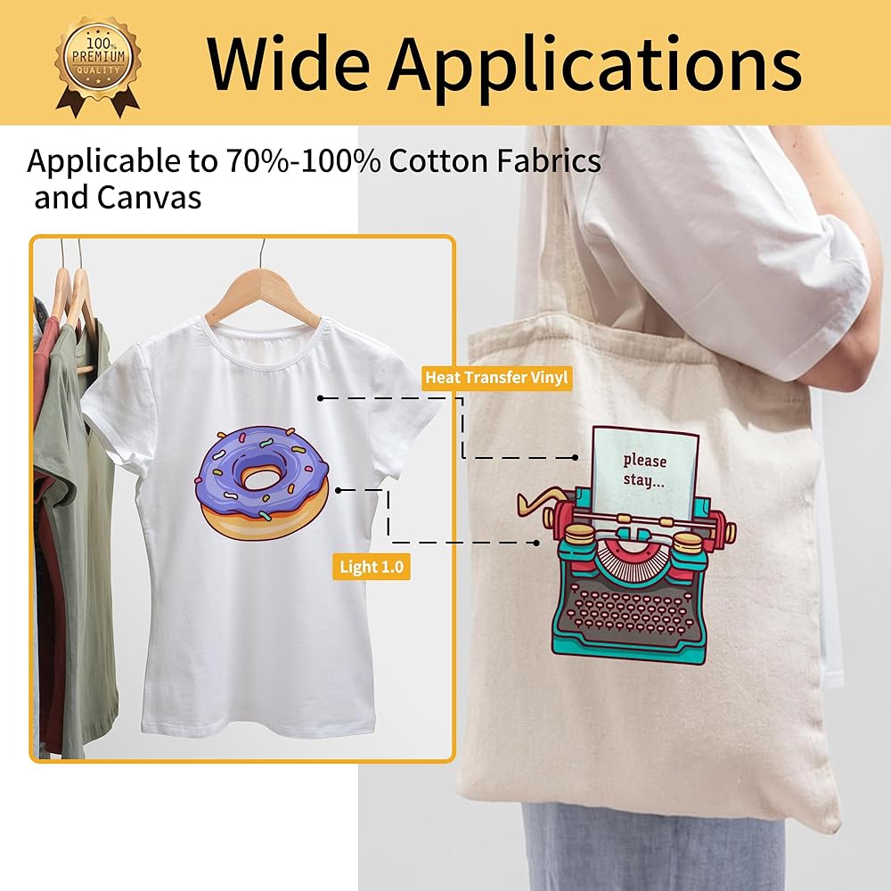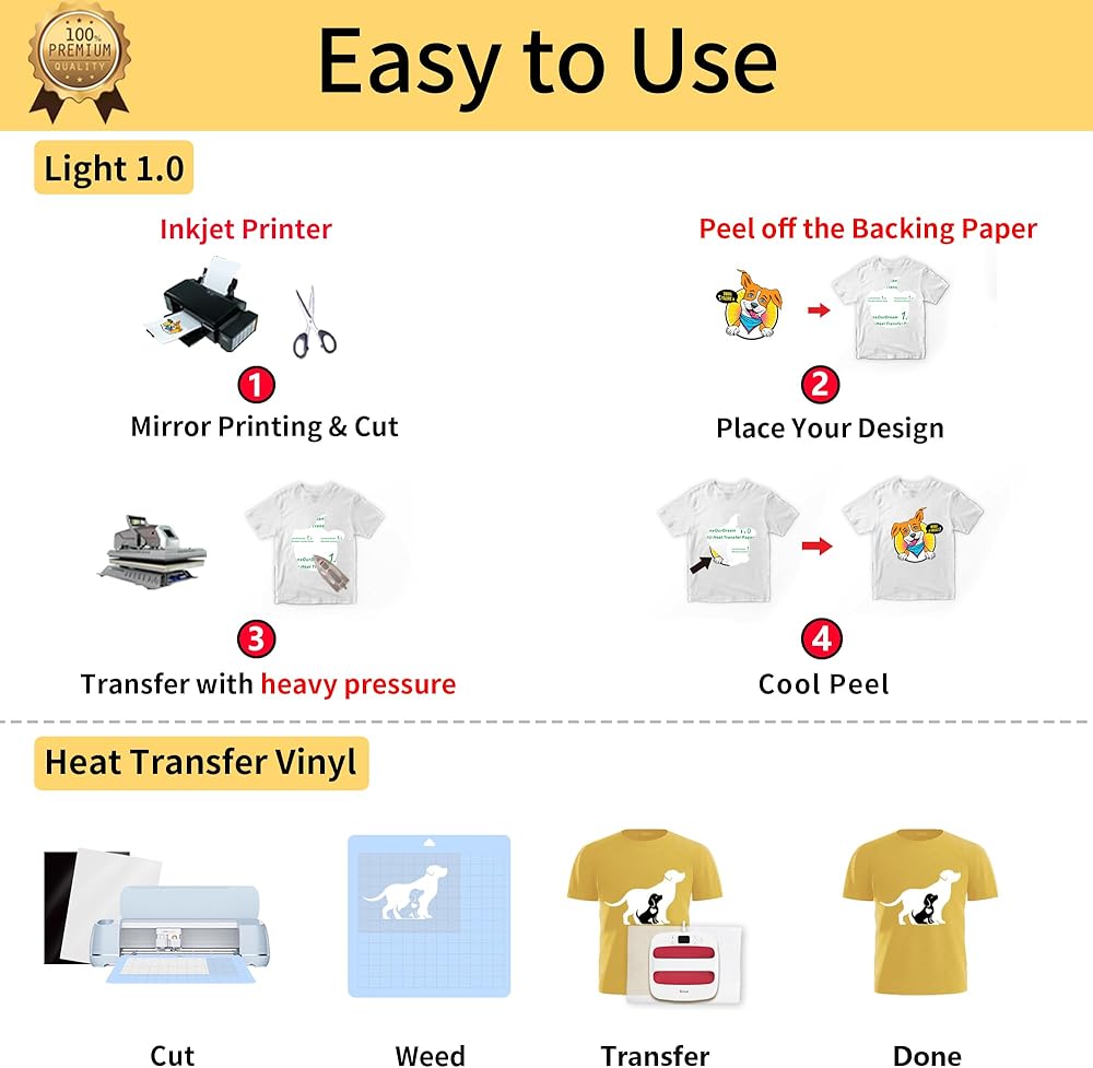 💕TRU-TRANSFER PAPER: Pack of 20 sheets Light transfer paper and 2 sheets heat transfer vinyl (Black & White). Light 1.0 classic transfer paper sticks GREAT to fabrics and extremely machine wash durable. Cool Peel and Wash In Cold Water. Very easy to use and even kids can transfer successfully. Compatible with inkjet printers, irons and heat press machines. If you are looking for the right transfer paper, this is the one! Look forward to your test of our products!