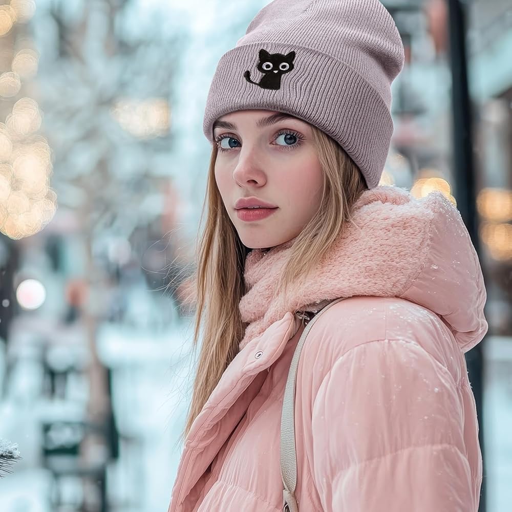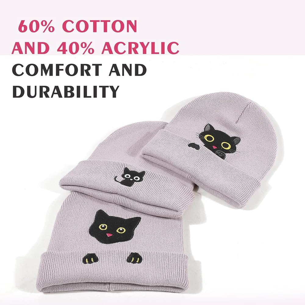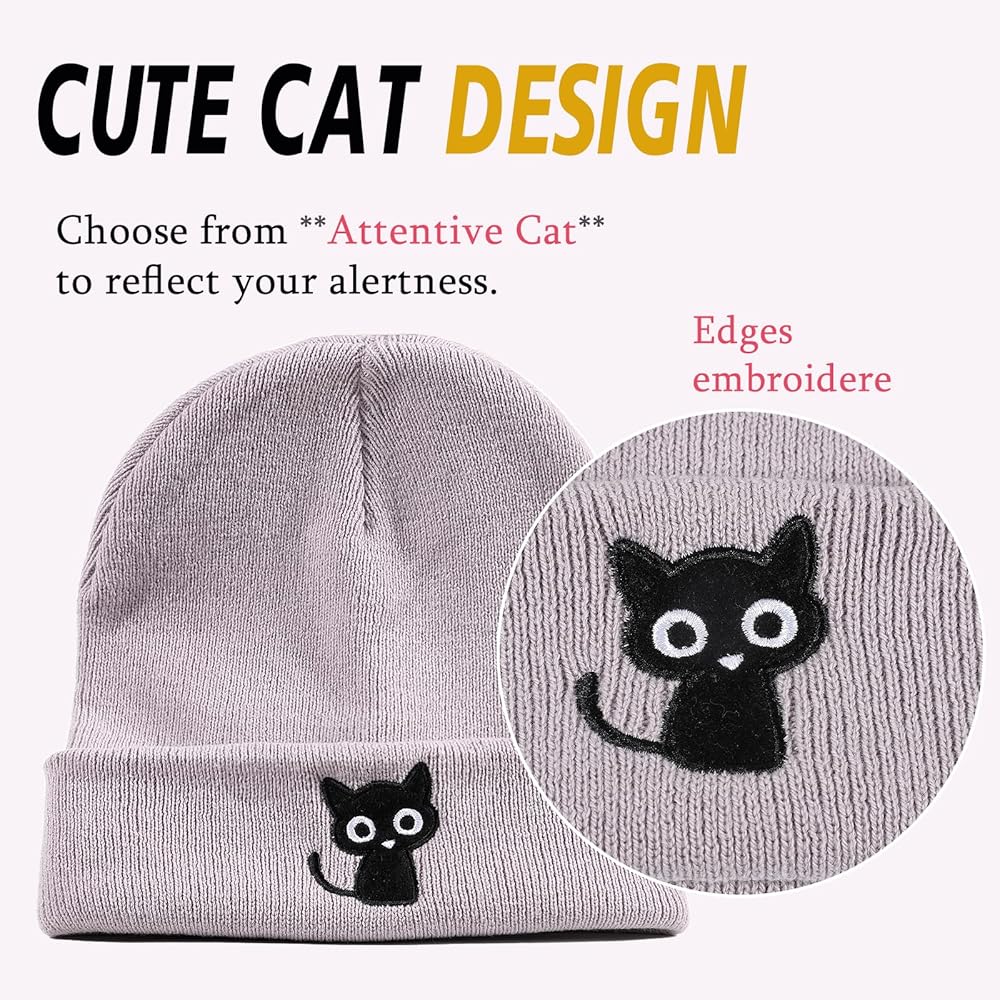 تصميم لطيف على شكل قطة: تتميز هذه القبعة ذات الأساور بنمط قطة أسود رائع يضيف لمسة مرحة إلى خزانة ملابسك الشتوية. اختر من بين **Cozy Cat** للاستمتاع بأجواء محببة، أو **Attentive Cat** لتعكس يقظتك، أو **Friendly Cat** لنشر الفرح. اختر التصميم الذي يناسب شخصيتك واحتضن قطتك الداخلية بهذه الملحقات الرائعة.