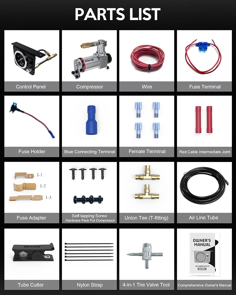 - المجموعة الكاملة: تتضمن الضاغط، ولوحة التحكم، وخطوط الهواء 1/4 بوصة، والأسلاك، ونقطة الإنطلاق الموحدة، وحزمة الأجهزة، وجميع المكونات الضرورية
