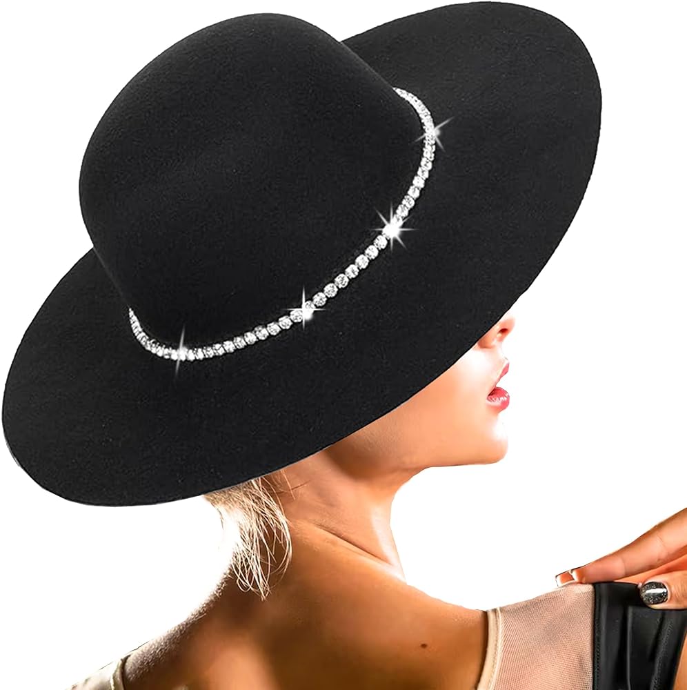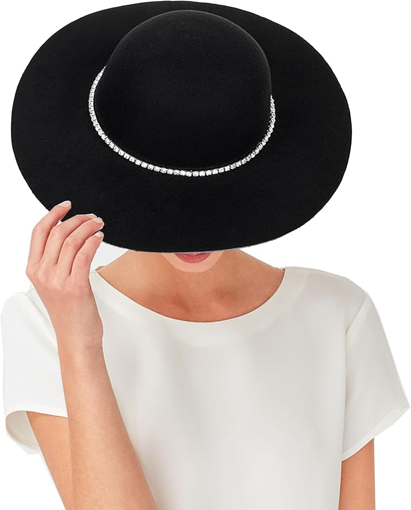 قبعات فيدورا للنساء نمط هيبورن واسعة حافة قبعة الشمس حجر الراين قبة علوية قبعة لباد أنيقة سيدة الزفاف قبعة مرنة