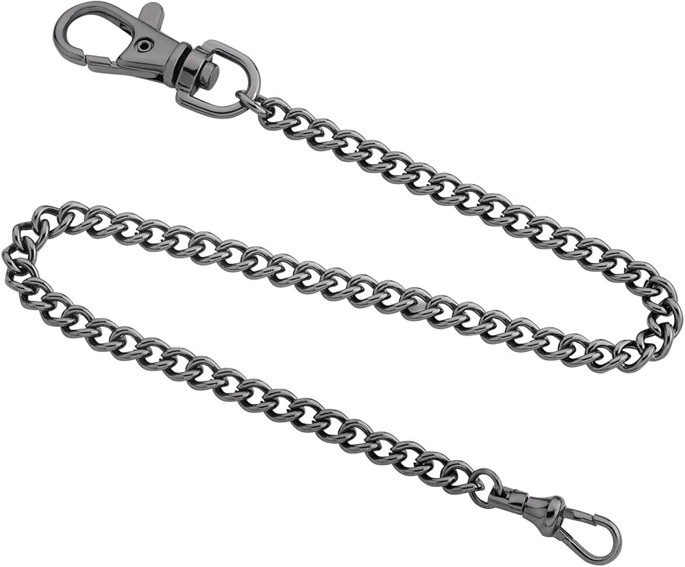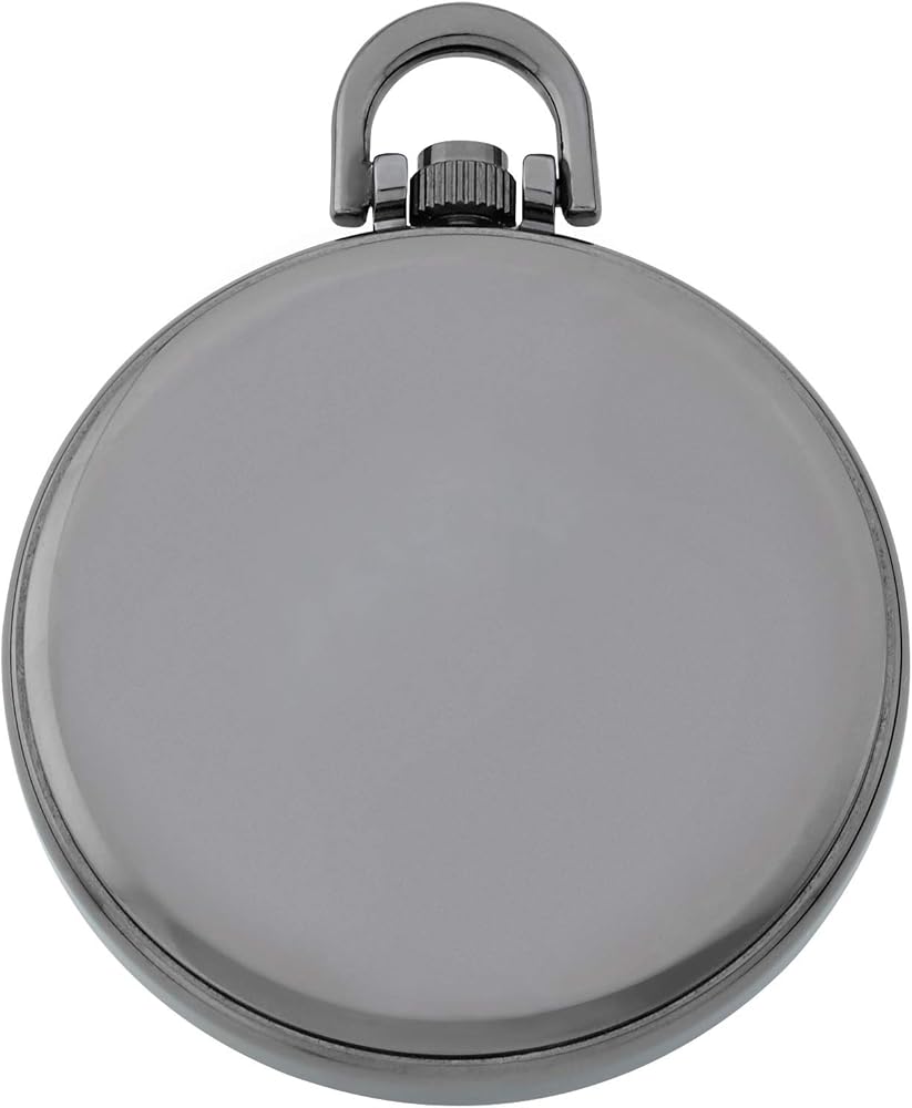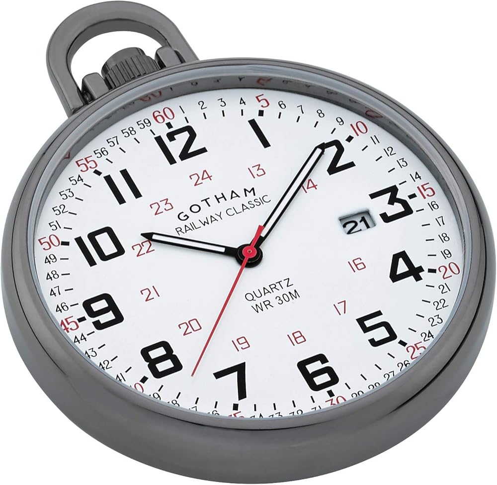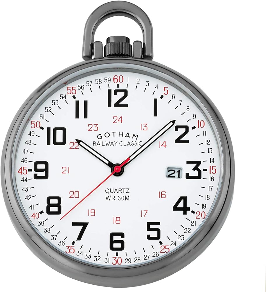 New from Gotham! Classic railroad style 49 millimeter gun-plated stainless steel open face pocket watch. Features include rich railroad style dial with 24 hour time and minute track, precision analog quartz battery operated date movement, slightly domed scratch resistant mineral glass crystal and 30M water resistant. Also included is a deluxe 14 inch stainless steel curb chain with lobster claw end piece. This beautiful yet solid pocket watch arrives with operating instruction, ,lifetime warranty and gift boxed.