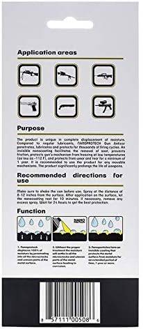 الغرض: المنتج فريد من نوعه في الإزاحة الكاملة للرطوبة. بالمقارنة مع مواد التشحيم العادية، فإن مسدس NANOPROTECH مضاد أو يخترق ويزيت ويحمي لآلاف دورات الإطلاق. تعمل طبقة النانو غير المرئية على تسهيل إزالة السخام، وتمنع الاحتكاك، وتحمي آلية البندقية من التجمد عند درجات حرارة منخفضة (تصل إلى -112 درجة) وتحمي من التآكل لمدة عام على الأقل. يوصى باستخدام المنتج لأي آليات متحركة. المنتج يطيل عمر الأسلحة بشكل كبير. الخصائص: تخترق الجسيمات النانوية بنية السطح المطبق، وتزيل الرطوبة، وتمنع التآكل، وتبني طبقة تقلل الاحتكاك والتآكل. لا يفقد المنتج خصائصه عند نطاق درجة الحرارة من - 112 درجة إلى +320 درجة. إنه غير ضار على جميع المواد ويمكن أن يتغلغل في الأماكن التي يصعب الوصول إليها. يمكن تطبيق المنتج على الأسطح الرطبة ويحافظ على مرونته لفترة طويلة. مجالات التطبيق: قضيب التشغيل، غطاء البرميل، دبوس الكامة، منفذ الإخراج المفتوح، أخدود السكك الحديدية المنزلقة، السكة المركزية، زنبرك الحركة والأجزاء المتحركة المشابهة. تعليمات الاستخدام الموصى بها: تأكد من رج العلبة قبل الاستخدام. رش على مسافة 8-12 بوصة من السطح. بعد وضعه على السطح، اترك طبقة النانو ترتاح لمدة 10 دقائق. إذا لزم الأمر، قم بإزالة أي رذاذ زائد. انتظر لمدة 24 ساعة للحصول على أفضل حماية. الاستهلاك: علبة واحدة سعة 22 قدم مربع. يوصى بالتطبيق في درجة حرارة تتراوح من -4 درجة إلى +95 درجة. العمر الافتراضي للمنتج: سنة واحدة أو أكثر بعد الاستخدام إذا تم استخدام المنتج في الظروف العادية.