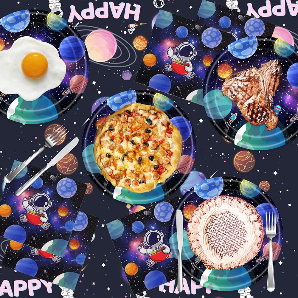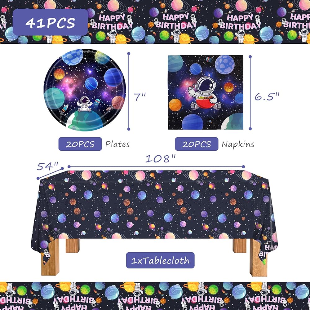 🪐【Outer Space Theme Party Supplies】Our birthday party tableware set contains 1 tablecloth and 20 napkins and 20 plates. The sufficient number can allow you to no longer buy other items. It is suitable for parties within 20 people.