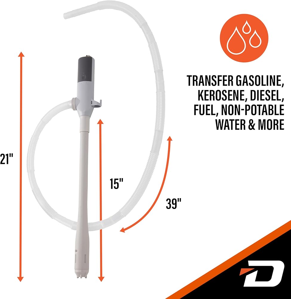 خرطوم نقل قوي متعدد الأغراض | يتيح لك الجهاز المحمول سحب ونقل جميع أنواع السوائل والوقود غير المسببة للتآكل بضغطة زر! | للاستخدام مع البنزين والكيروسين والديزل والزيوت الخفيفة والمياه غير الصالحة للشرب والمبيدات الحشرية الكيميائية والصابون والمنظفات ومزيلات العرق والأحماض الخفيفة ومضاد التجمد وما بعده