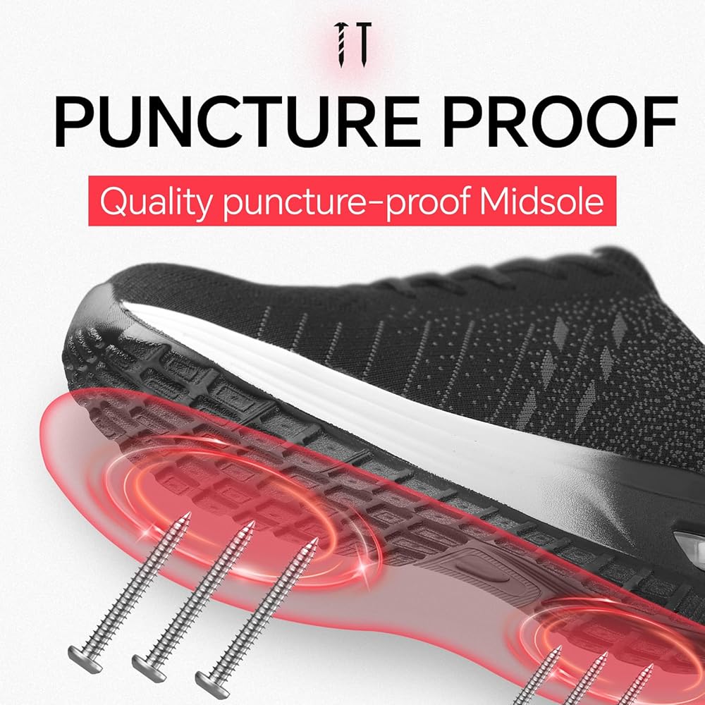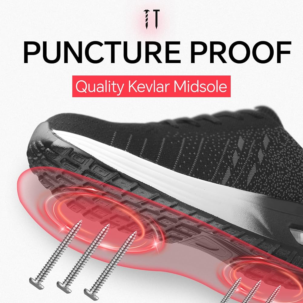 راحة طوال اليوم ومقاومة للثقب: تتميز بنعل داخلي ناعم وداعم لراحة طويلة الأمد، كما تشتمل أحذية الأمان هذه أيضًا على نعل أوسط من كيفلار للحماية من الثقوب الناتجة عن الأشياء الحادة مثل الأظافر والزجاج.