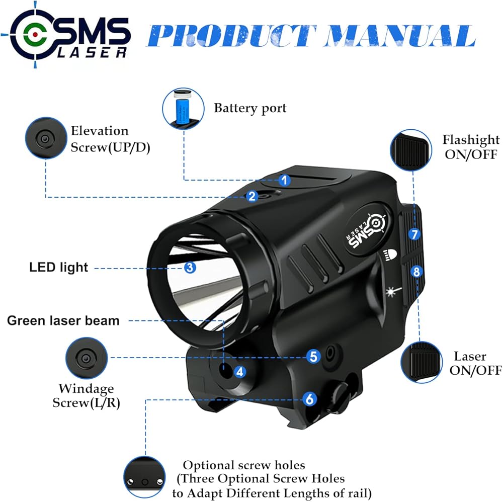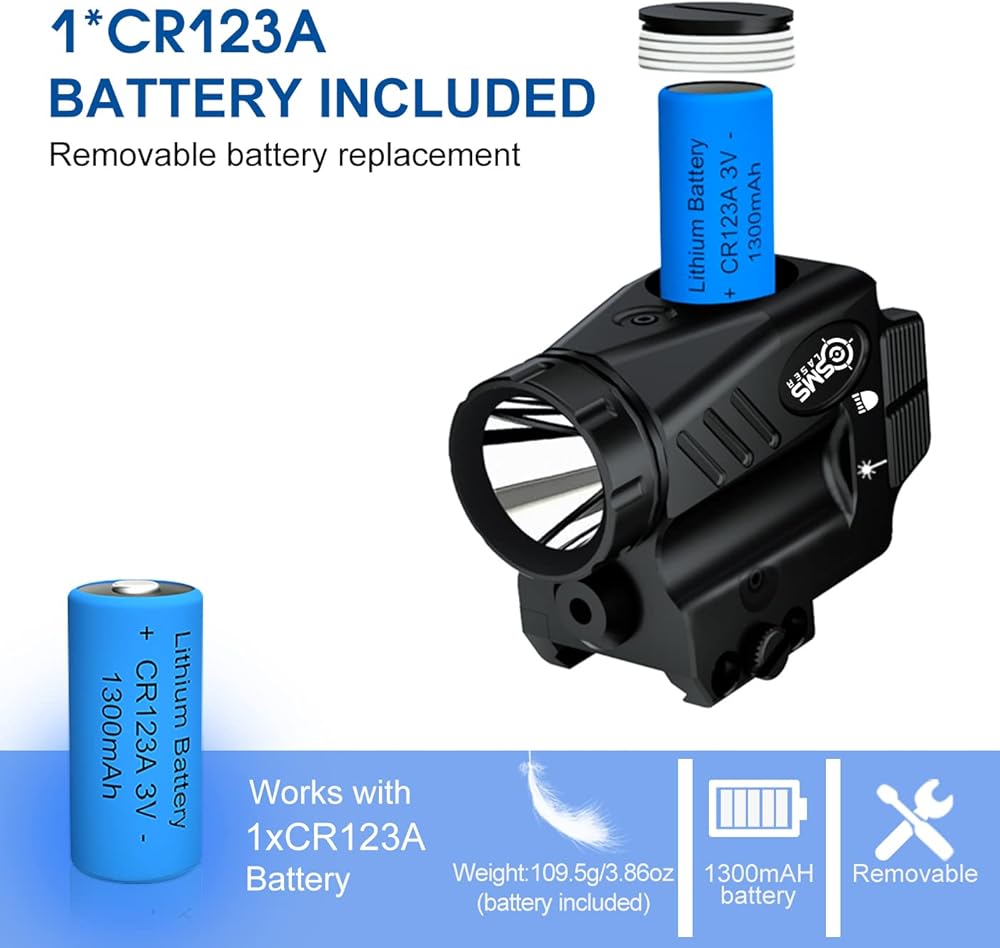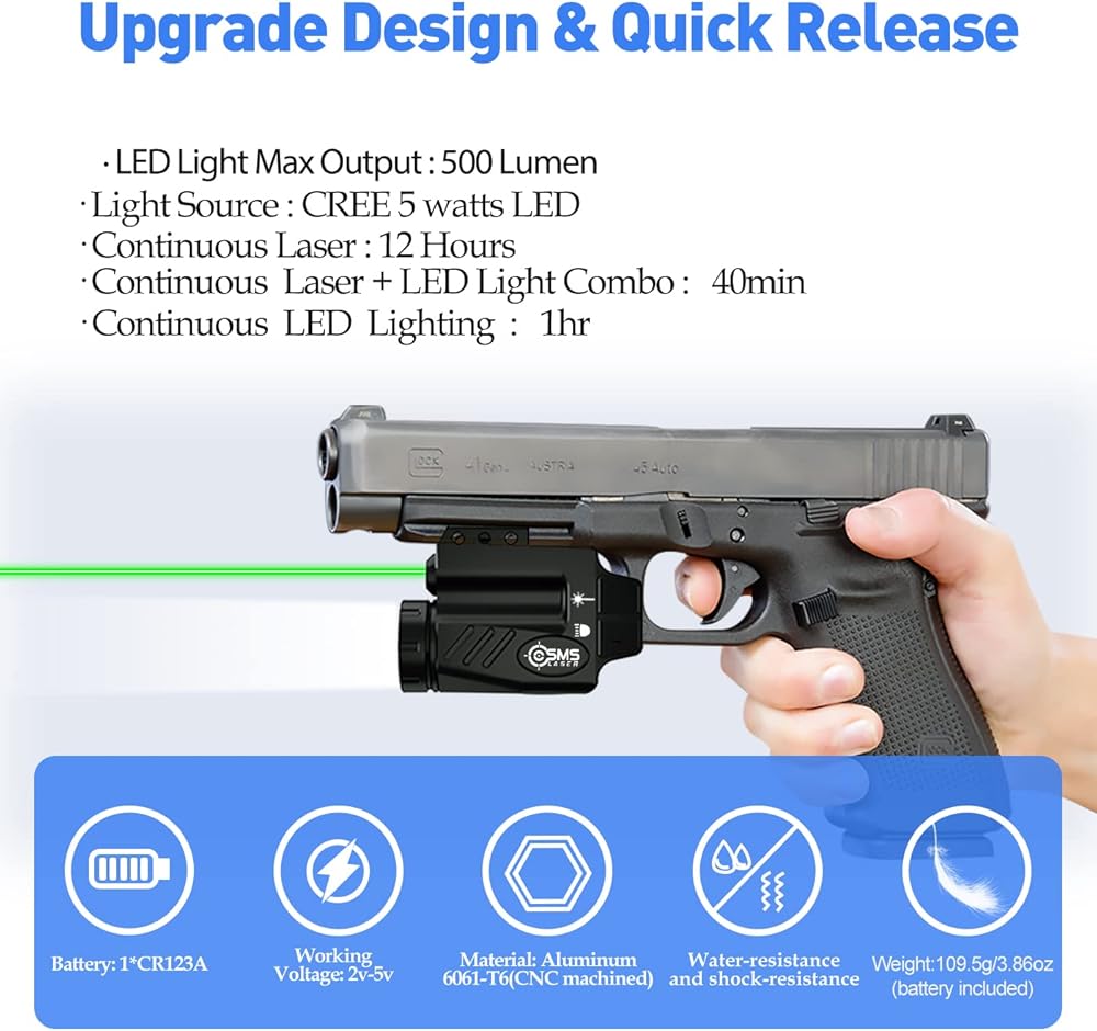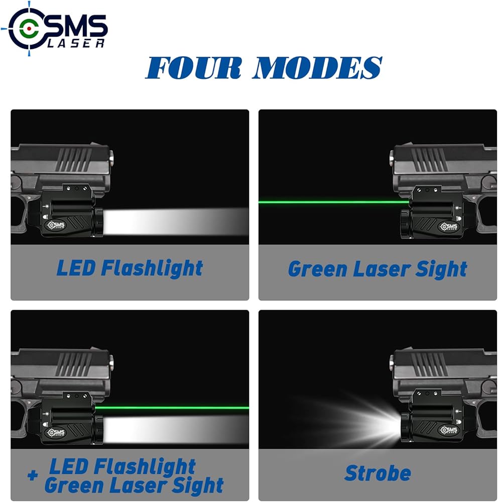 Ambidextrous on/off switches and four function buttons (Laser/Led/Combo/Strobe): The tactical flashlight pistol light rail mounted 500 lumens weapon lights with strobe function for handgun can be turned on easily by a left-handed shooter without having to flip the gun over to push the button with the right hand; Four different modes switch: flashlight only, laser only, flashlight green dot laser combo, strobe mode. Easy toggle switches between pinpointing or disorienting your focused target.