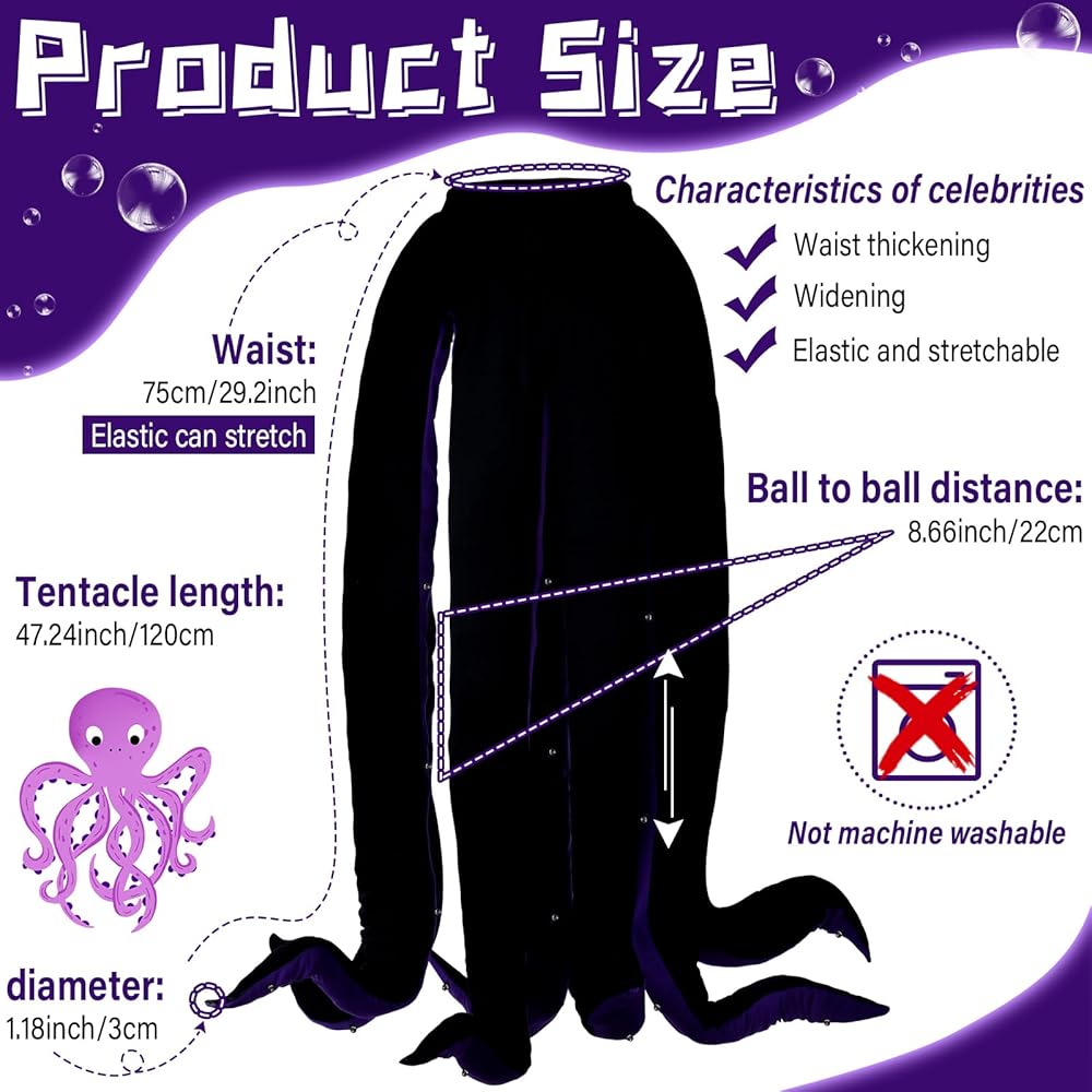 • تصميم واقعي ومبتكر: زي الأخطبوط الخاص بنا للهالوين مستوحى من الأخطبوط المضحك، والمخالب الطويلة مصممة للإشارة إلى الأسفل، مما يجعل الحركة تبدو نابضة بالحياة. تم تزيين المجسات الطويلة بخيوط خفيفة، مما سيجعلك مميزًا بالتأكيد في الحفلة عندما يتم تشغيل الأضواء ليلاً.