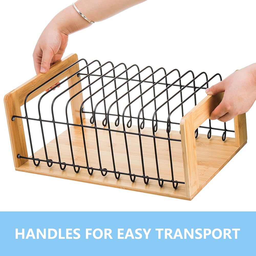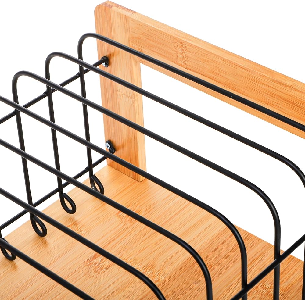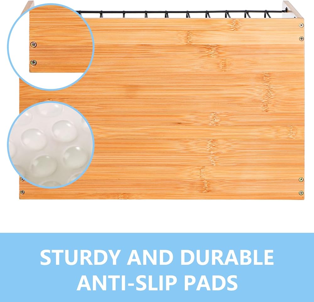 قوي ومتين: تم تصنيع رف الحافظة مباشرة من الخيزران عالي الجودة وسلك مطلي بالمسحوق للحصول على هيكل ثابت. الجزء السفلي مزود بـ 4 أقدام غير قابلة للانزلاق لتجنب خدش الطاولة أو السقوط أثناء الاستخدام