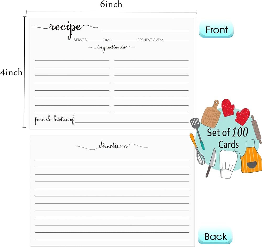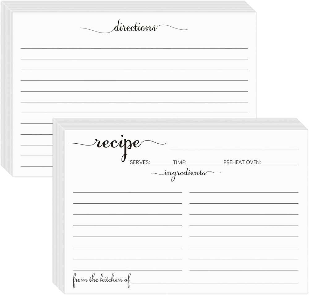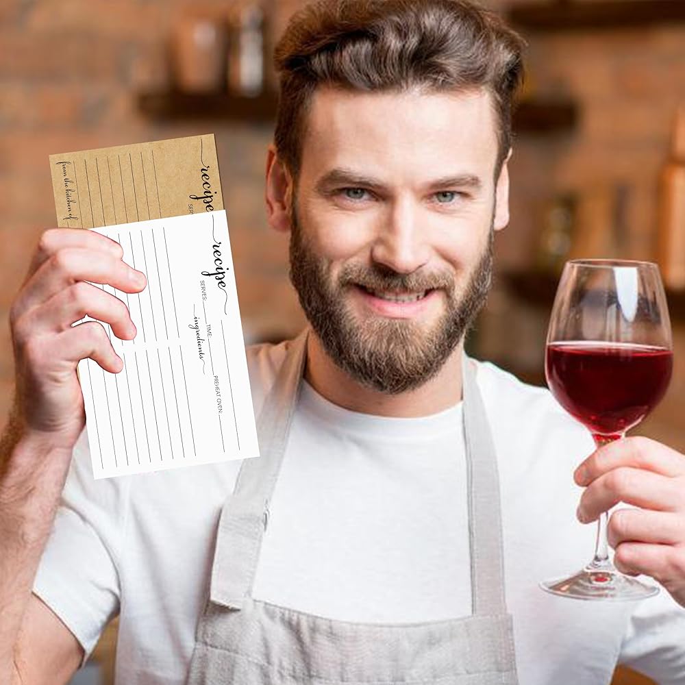صُنعت لتدوم طويلاً: 100 قطعة من بطاقات الوصفات ذات الوجهين 4x6 مصنوعة من ورق سميك ومتين 14pt (140lb/300gsm) والذي سيصمد أمام اختبار الزمن. لمسة نهائية ناعمة وغير مطلية من السهل الكتابة عليها، ولن تتلطخ ولن تنزف. بطاقات الوصفات هذه ذات الحروف والخطوط السوداء مصنوعة من ورق مقوى سميك بما يكفي لمنع الحبر من المرور، موثوقة وتدوم طويلاً لتتمكن من خلق ذكريات دائمة للخبز مع العائلة.