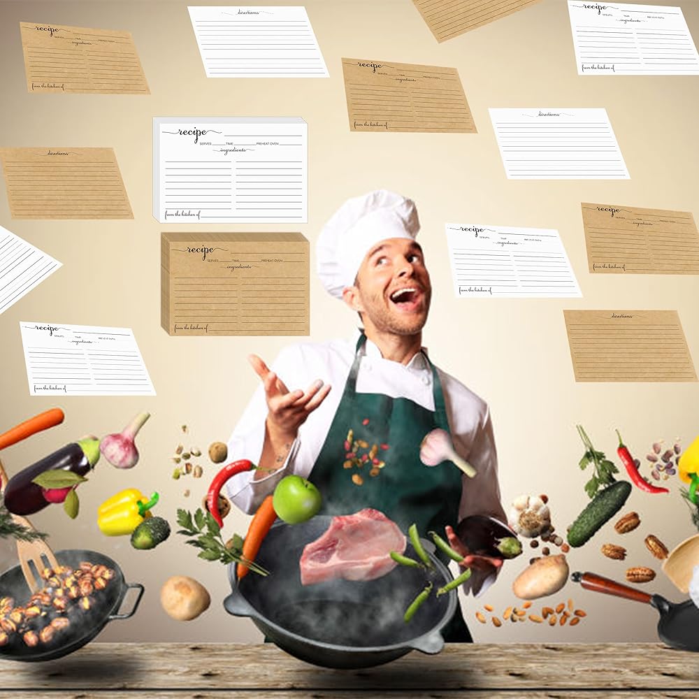 بطاقات عالية الجودة: باستخدام ورق وطباعة عالية الجودة. حجمه القياسي يضمن ملاءمته تمامًا لصندوق الوصفات أو حامل كتب الطبخ الخاص بك، مما يوفر طريقة مريحة ومنظمة لتخزين وصفاتك المفضلة. مثالي لحفلات الزفاف والهدايا وتحديث صندوق الوصفات الشخصية أو الموثق الخاص بك!