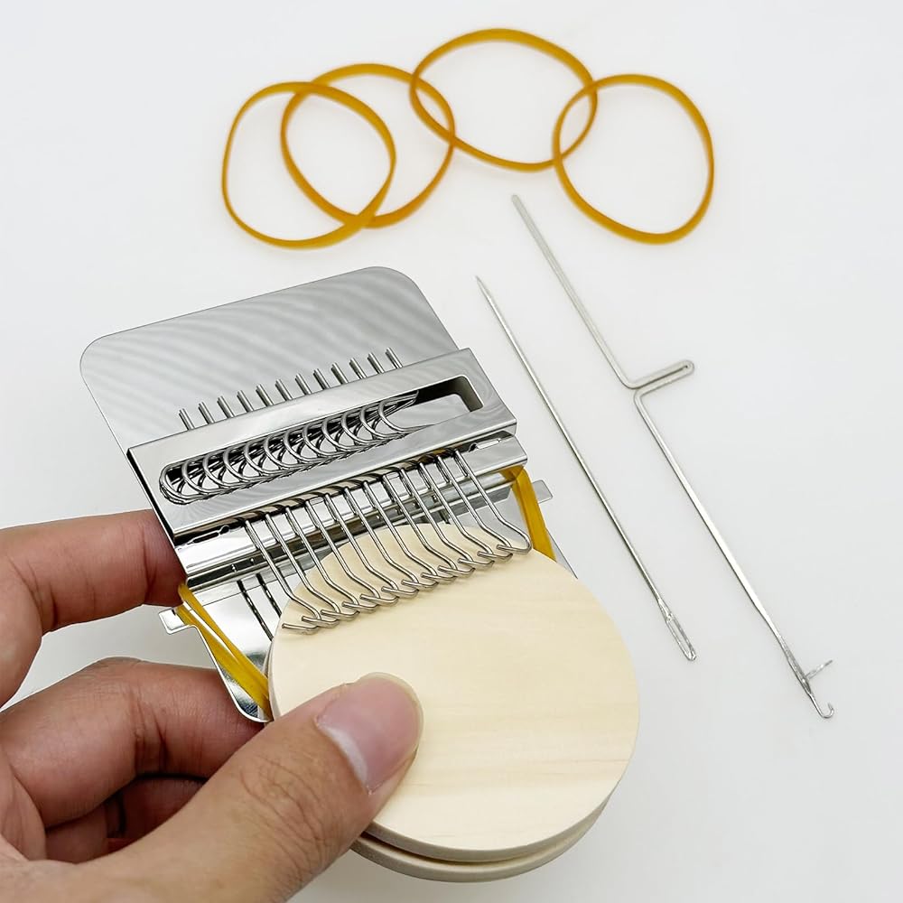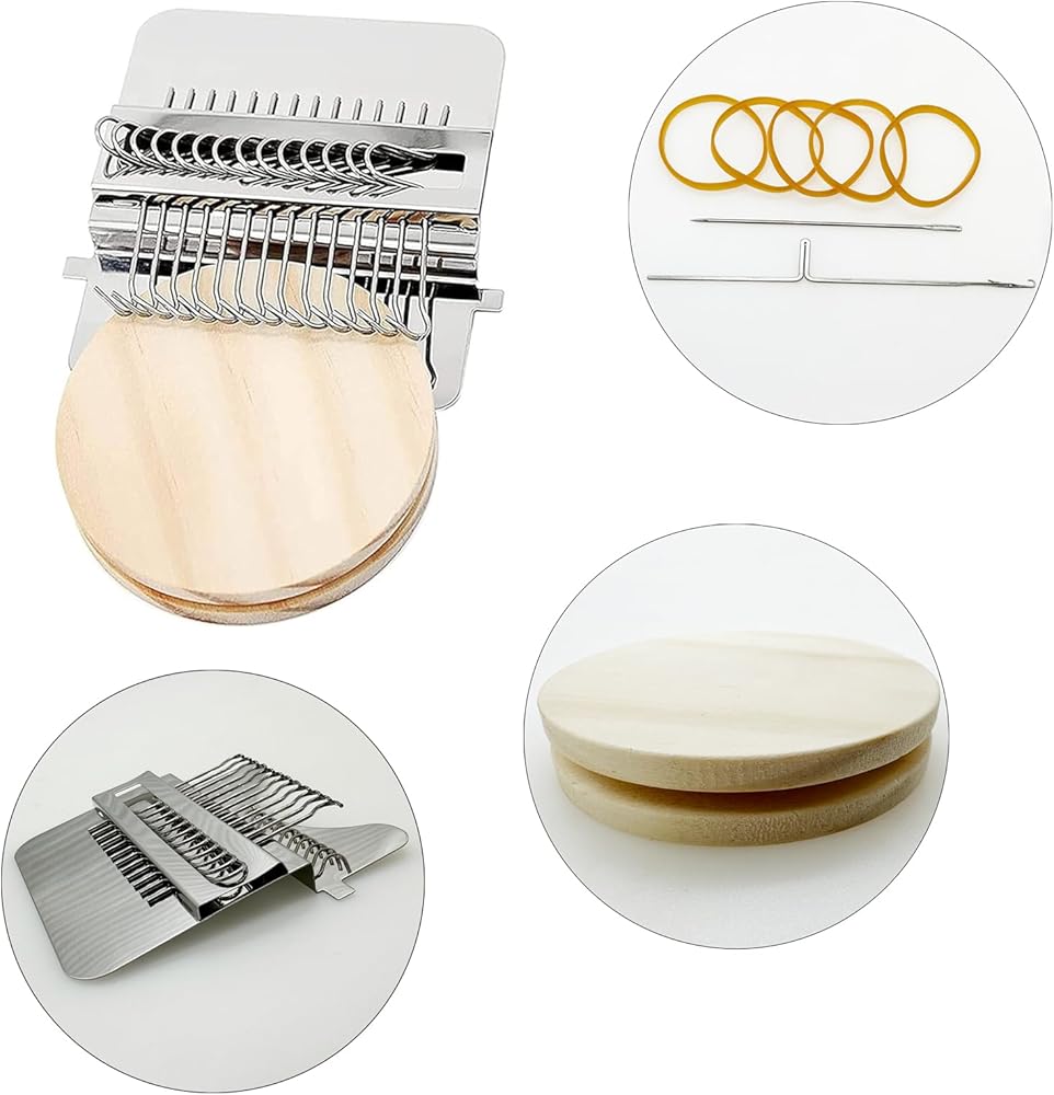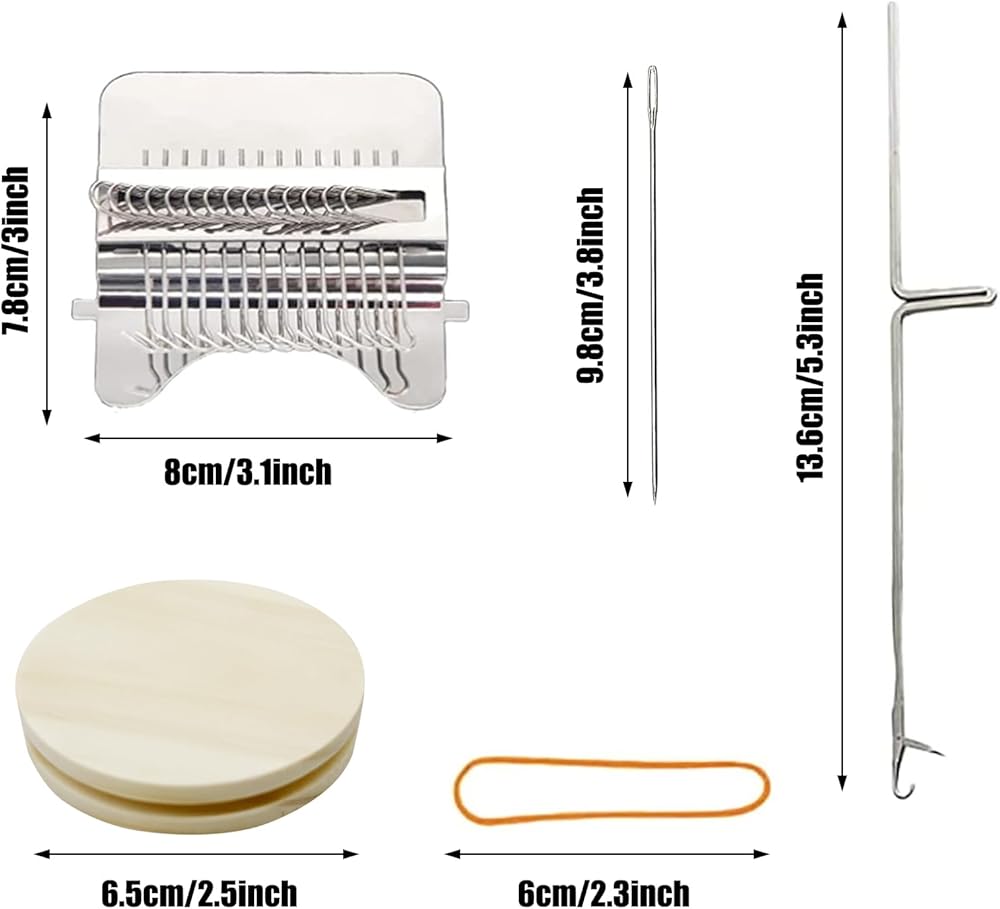 • ❤ You will get: 1 PCS 12 hooks mini darning machine, 1 PCS wooden disc, 1 PCS crochet hook, 1 PCS sewing needle, 5 PCS rubber bands, 1 PCS instruction manual.
