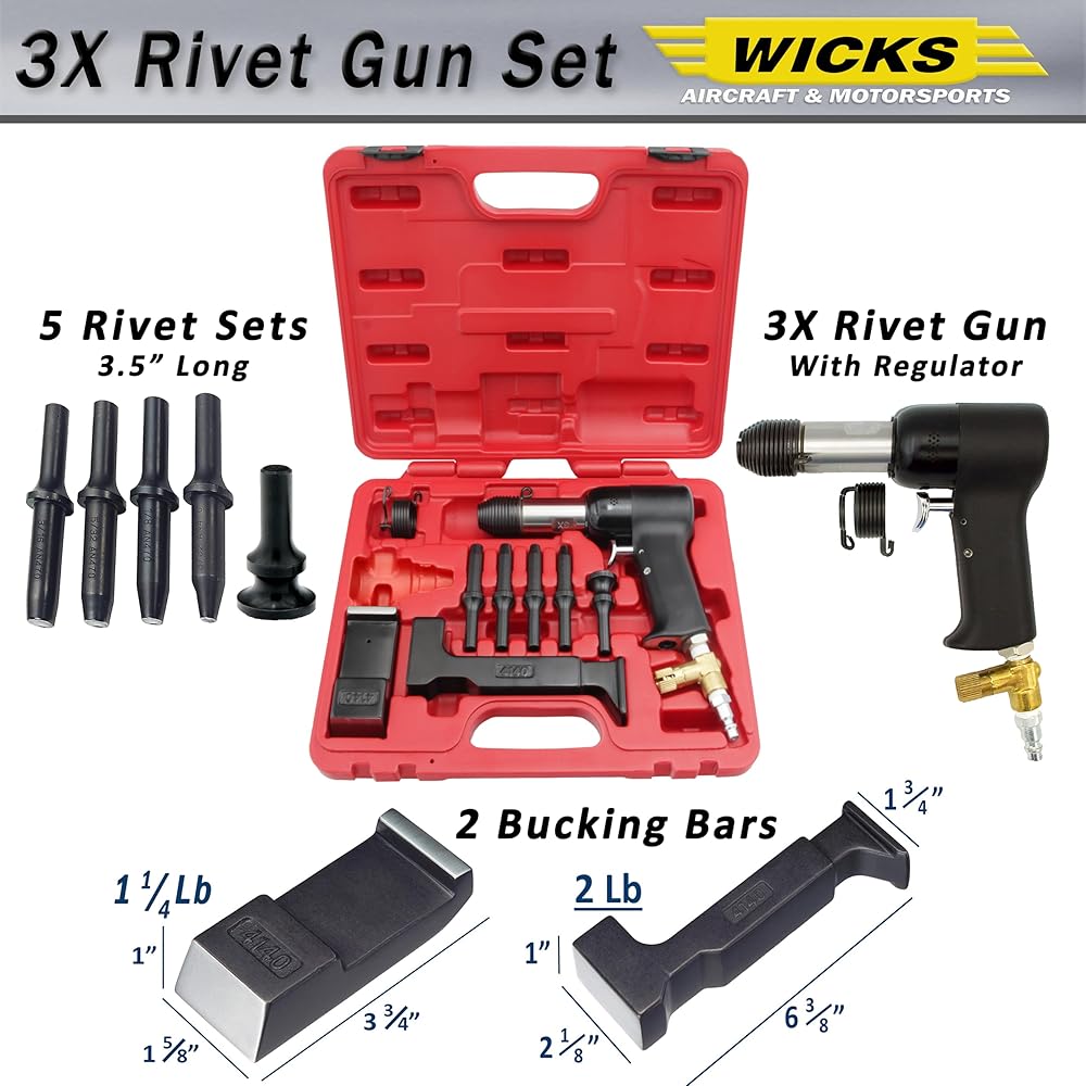 • تعد مجموعة أدوات التثبيت 3X Rivet Gun Kit من Wicks Aircraft and Motorsports مجموعة كاملة من كل ما تحتاجه للبدء في تركيب المسامير الصلبة.