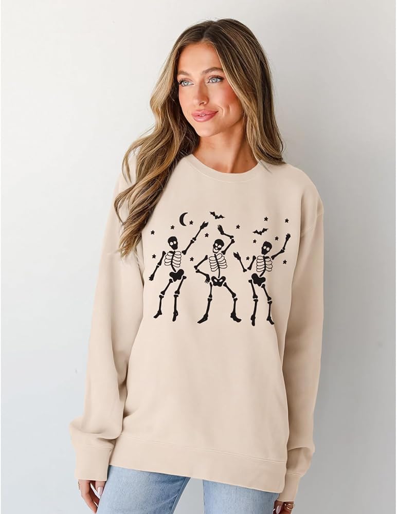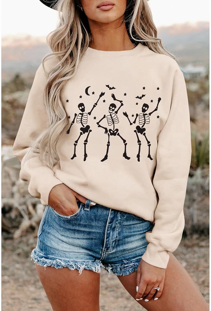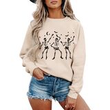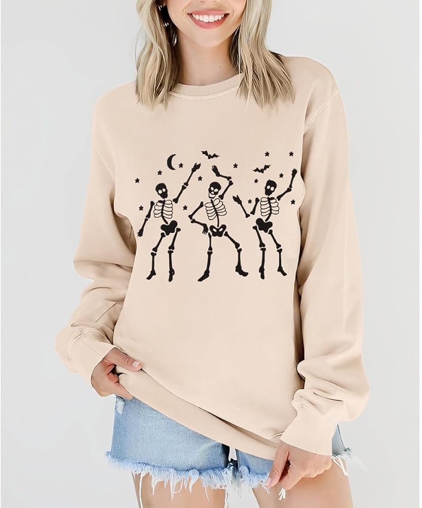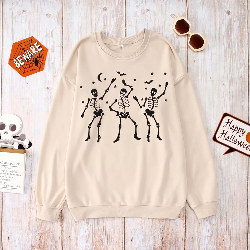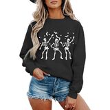🎃التصميم: سويت شيرت نسائي عتيق للهالوين، قميص طويل الأكمام للهالوين مع رقبة دائرية كلاسيكية، سويت شيرتات طويلة الأكمام للهالوين كبيرة الحجم مع طباعة جرافيك جمجمة راقصة مرحة، بلوفر جمجمة، هذا السويت شيرت ذو الهياكل العظمية الراقصة للهالوين للنساء/قمصان الهالوين طويلة الأكمام ستجعلك تشعرين المزيد من الموضة والساحرة.