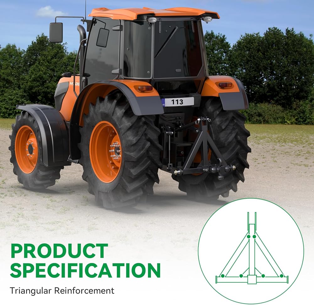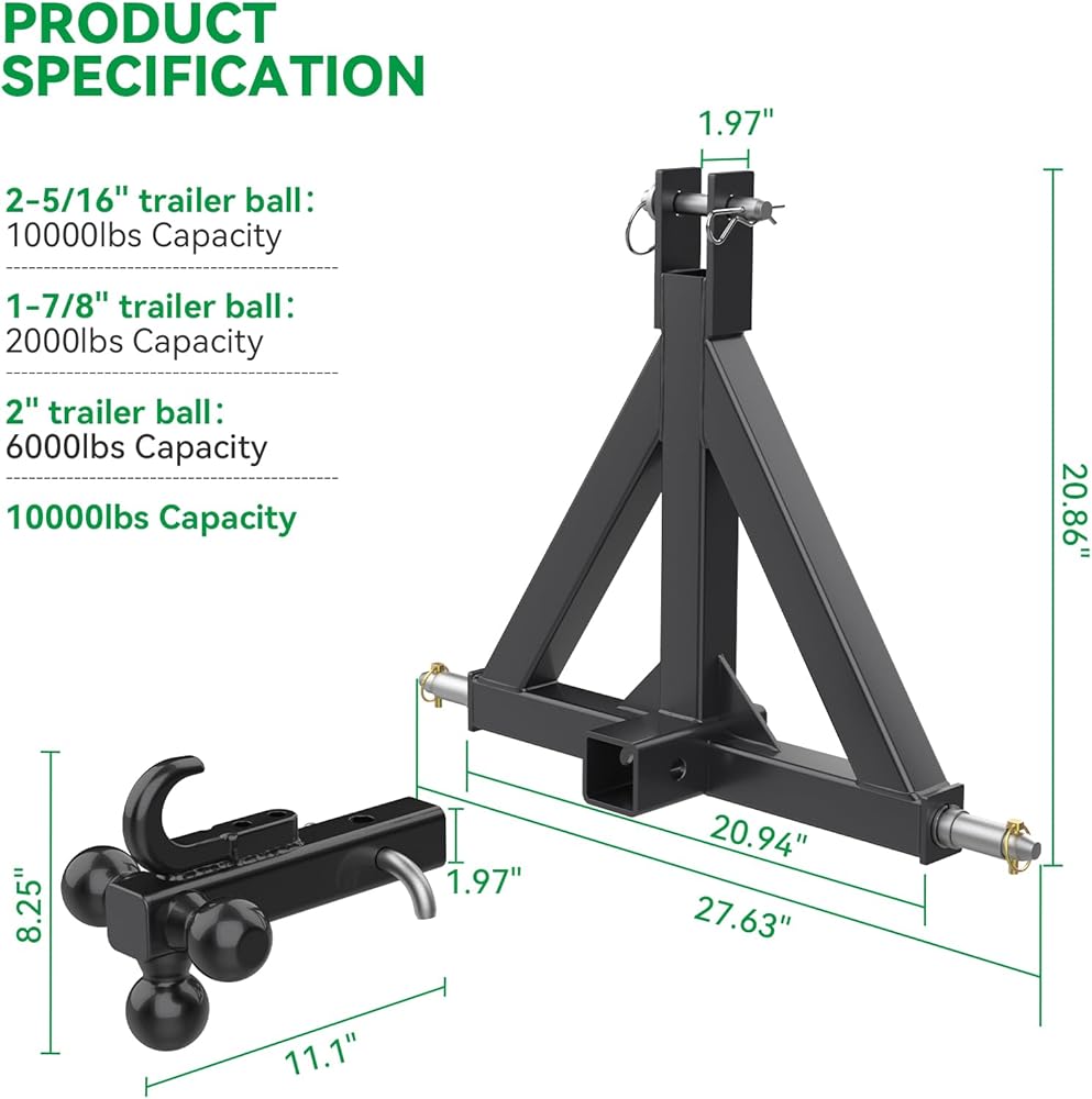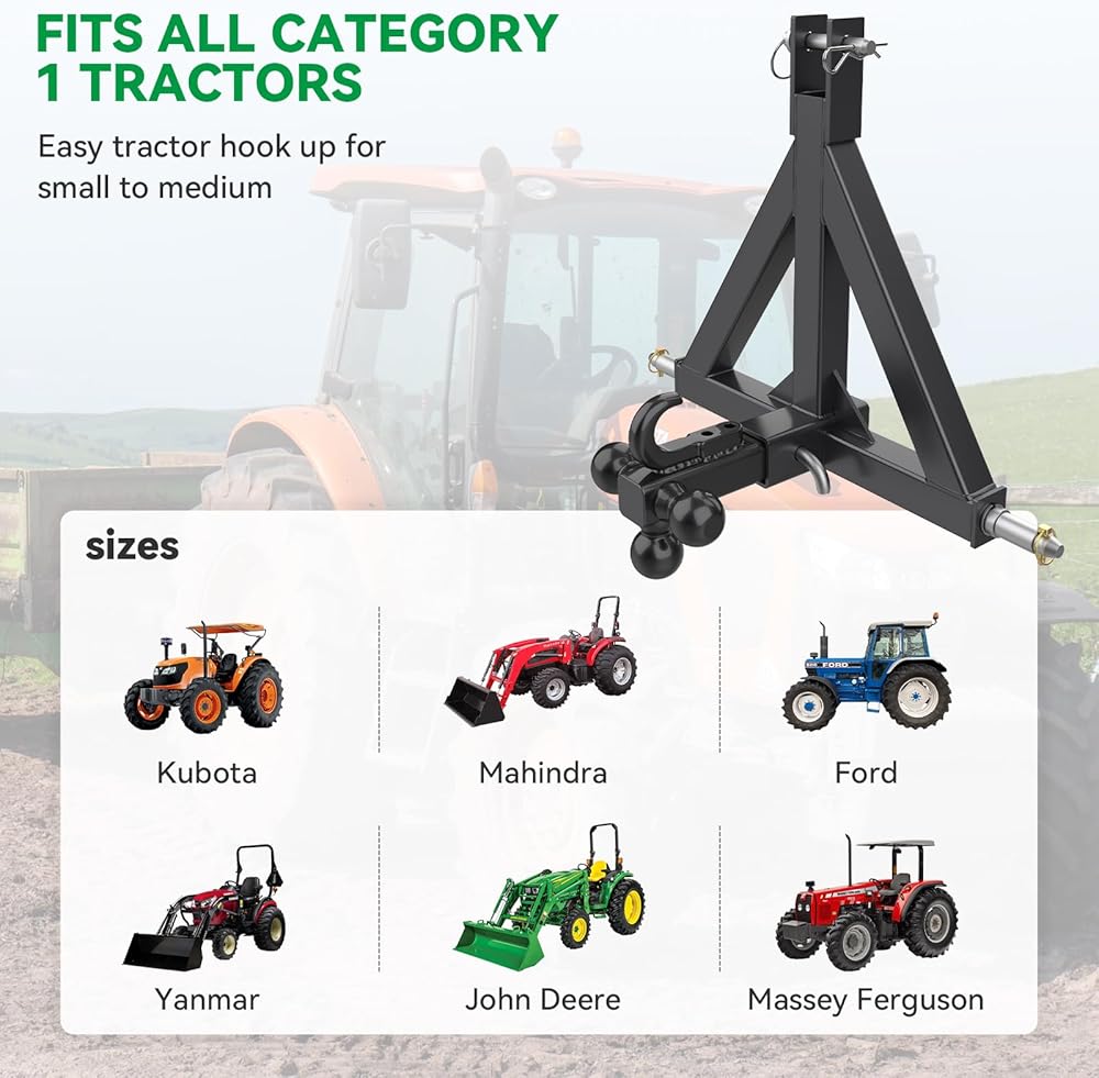 Wide Application: Three ball weights of trailer hitch ball 2 inch are 2,000lbs, 6,000lbs, 10,000lbs; hook capacity: 10,000 lbs. The 3-point quick hitch category 1 attachment is equipped with a 7/8" diameter class 1 lift pin. This tow hitch is for use with BX Kubota, John Deere, LM25H, WLM tractors, etc. You can use it on farms, factories, warehouses, estates, and more.