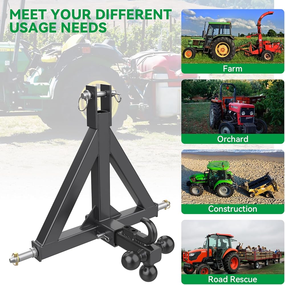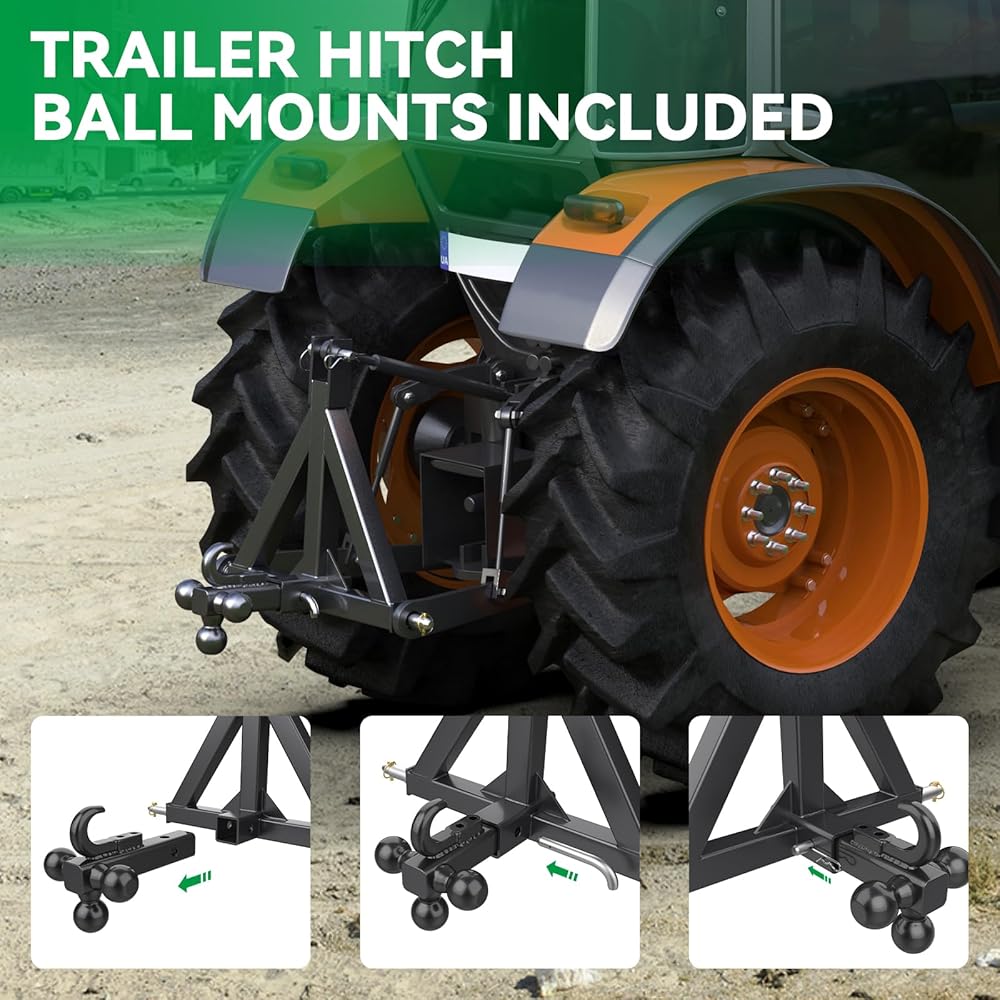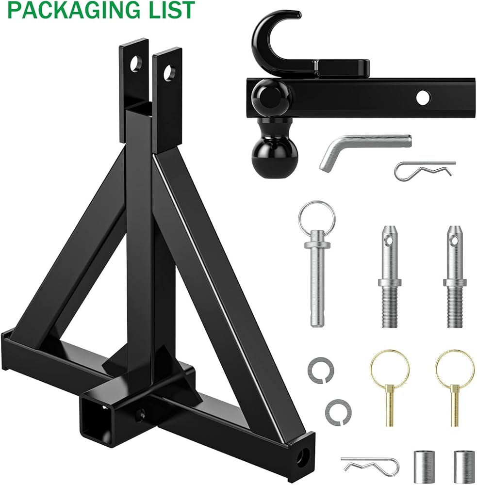 Unique Design: 3 point 2" receiver with trailer ball hitch can be used for light and small tractors as well as for quick connection of larger tractors. Its surface is protected by a layer of black powder, and the material is made of stainless steel, which can better prevent the product from rusting, and corrosion resistance, and increase its service life. It is a high-quality and durable trailer hitch.