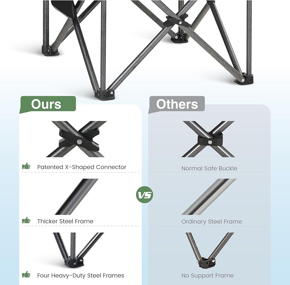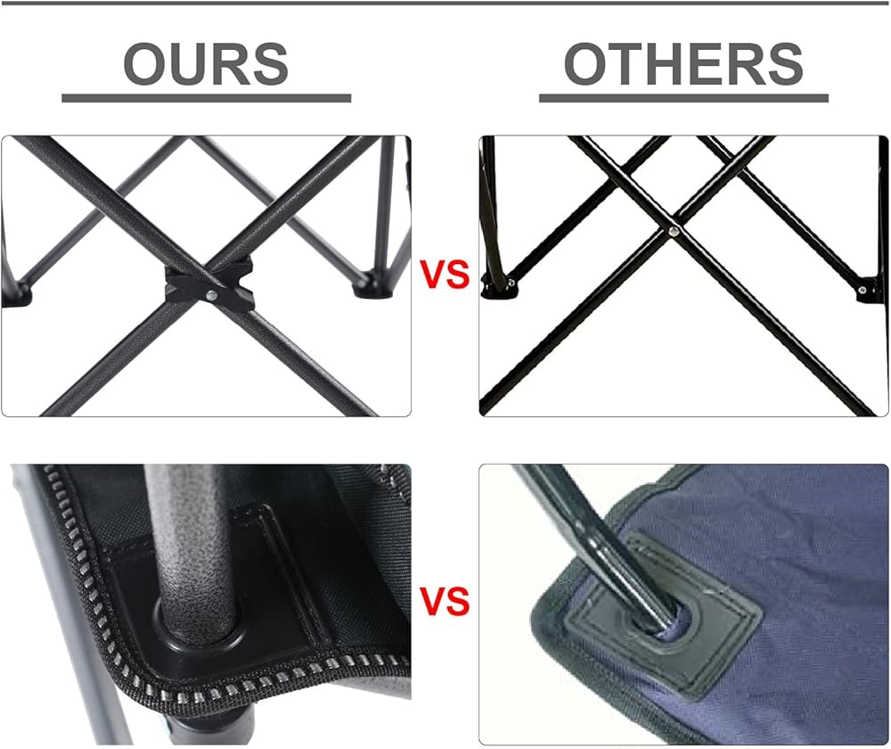 ☆ مادة متينة: يحتوي كرسي التخييم هذا على طلاء مسحوق بدرجة مطرقة يمكن أن يمنع التآكل واختفاء اللون. تمت إضافة أربعة إطارات فولاذية شديدة التحمل إلى الجزء السفلي من الكرسي لتعزيز الثبات. هيكل إطار فولاذي قوي يجعله يمكنه دعم ما يصل إلى 450 رطلاً/200 كجم. نسيج أكسفورد 600D مقاوم للتمزق والتآكل، مما يضمن بقاء هذا الكرسي لسنوات قادمة.
