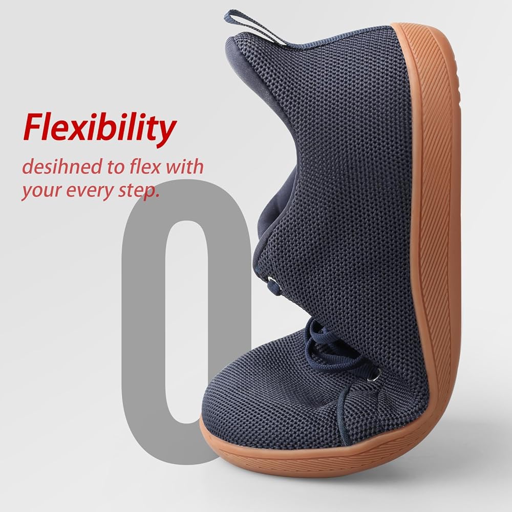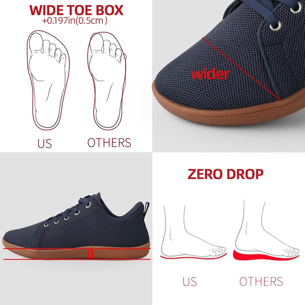 صندوق عريض لأصابع القدم - بالمقارنة مع أصابع أحذية المشي التقليدية، تتميز أحذية حافية القدم بتصميم أوسع عند أصابع القدم. تتمتع أصابع القدم بمساحة أكبر، حتى تتمكن القدم من الحصول على قبضة أفضل وشعور بالقدم، وفي الوقت نفسه، لن تكون أصابع القدم تكون مشوهة بسبب الضغط.