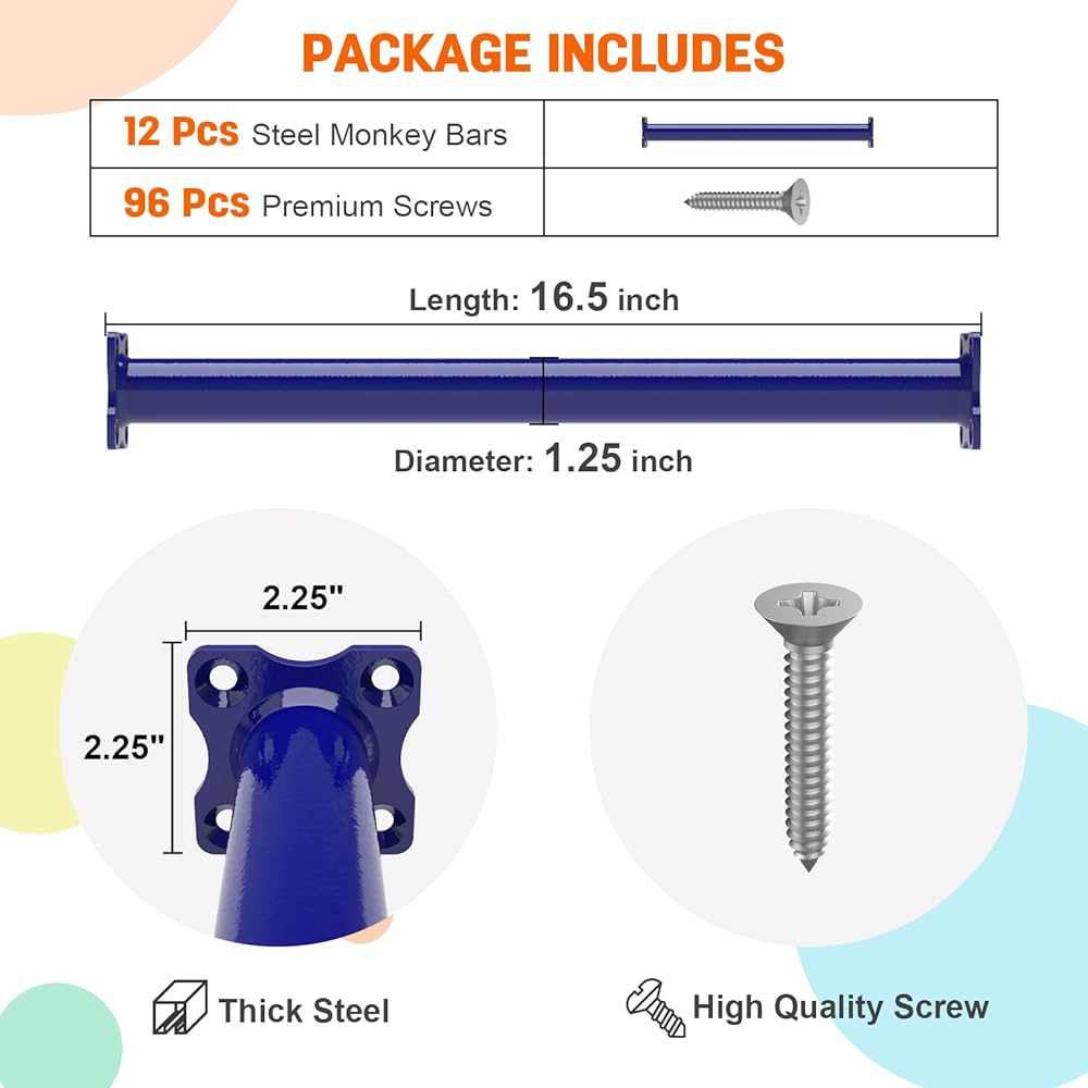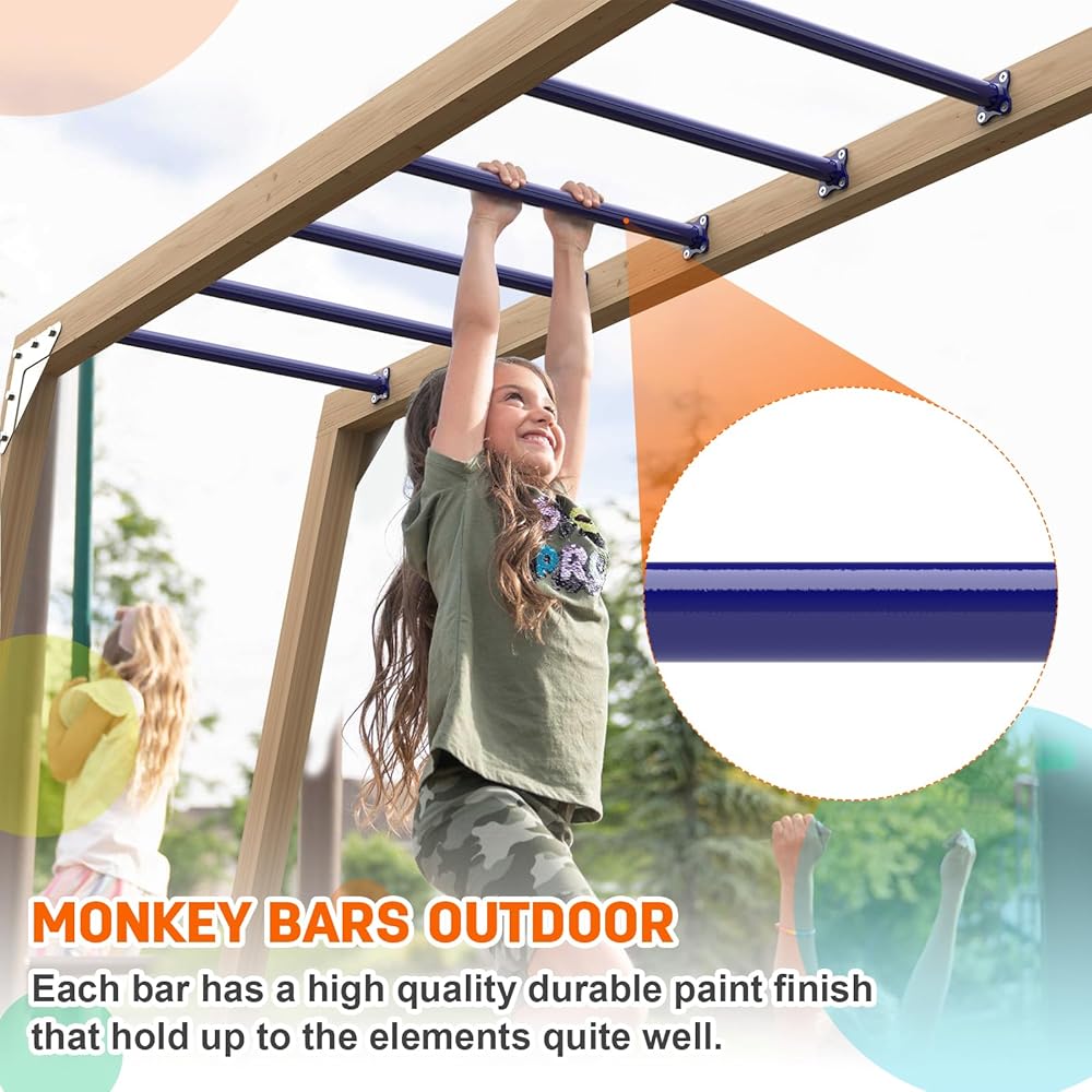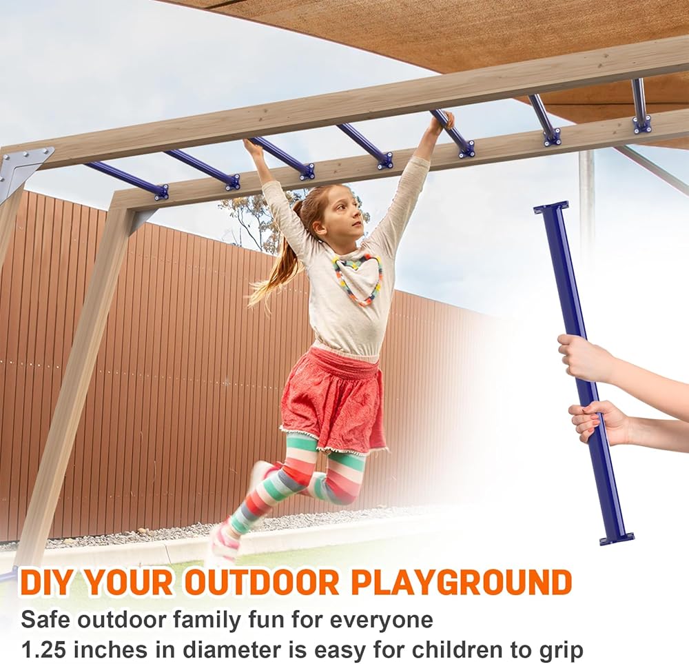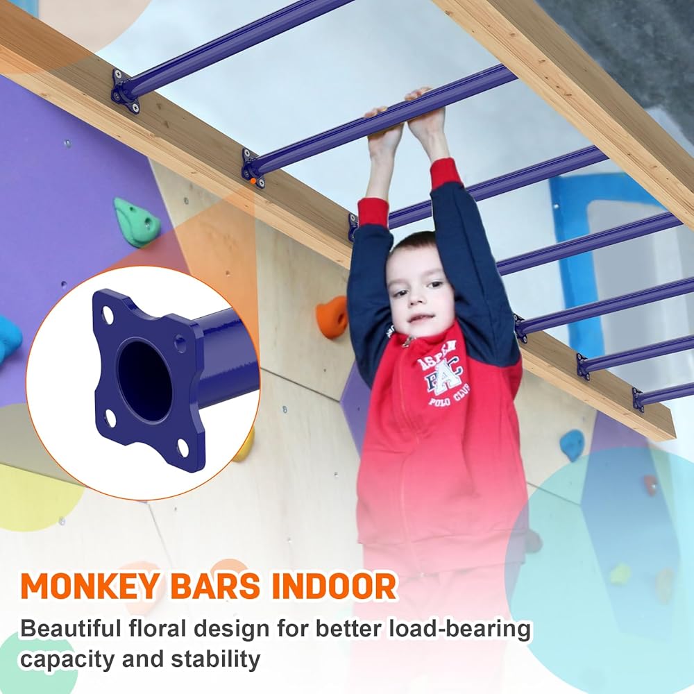 استخدامات متينة ومتعددة: مجموعة قضبان القرد مطلية بطبقة مقاومة للطقس باللون الأزرق الداكن، وليس من السهل أن تصدأ، ويمكن استخدامها في الهواء الطلق. يمكنك تركيبها في الفناء الخلفي الخاص بك، والحديقة، وغرفة المعيشة، وغرفة اللعب، ومجموعة التأرجح، ومنزل الشجرة، وصالة الألعاب الرياضية في الغابة، وإطار التسلق، وأسرّة بطابقين.