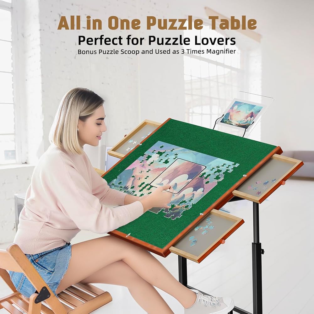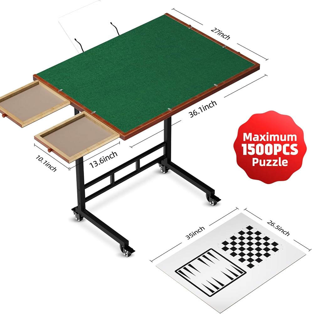 Puzzle Table with Drawers, 1500 Piece Jigsaw Puzzle Board with Wood Cover and Shelf, Tiltable and 14 Levels Height Adjustable, Foldable Puzzle Tables with Wheels for Adults Puzzle Enthusiasts Green