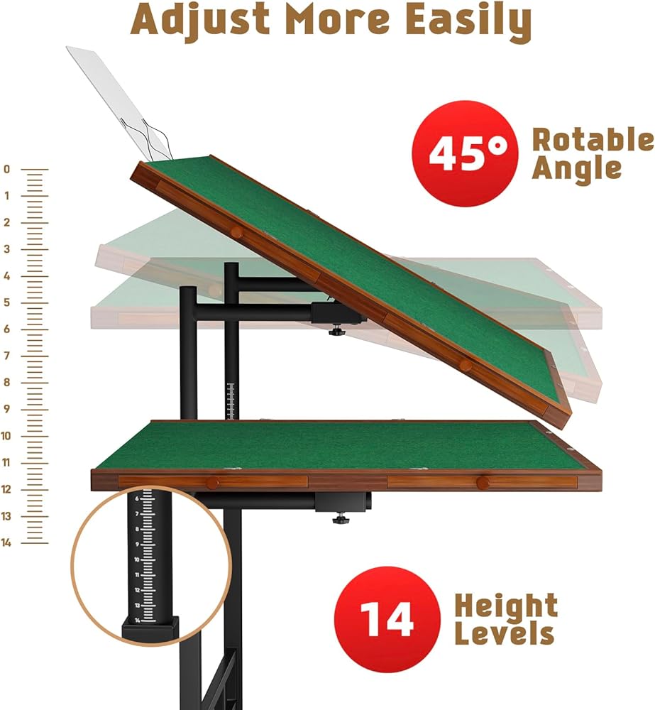 【Height and Tilt Angle Adjustable】With 14 height levels adjustable for this puzzle desk, you can line up easily with the clear height marks. The angle is 45-degree rotable. You can adjust the height and angle for the most comfortable position, no stiff neck or paining back any more. The large space under the table can make your legs in a relaxed and comfortable status when you play puzzles.