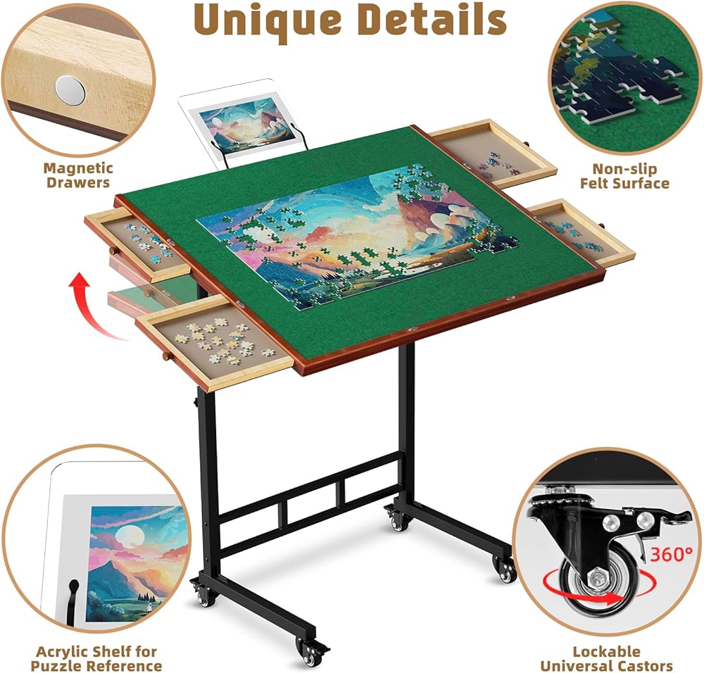 【1500pcs Puzzle Station】Tired of puzzling chaos? This rolling puzzle table for up to 1500pcs jigzaw puzzles creates a dedicated puzzle station for you to enjoy puzzling or game times. No worries about unfinished puzzle storage.